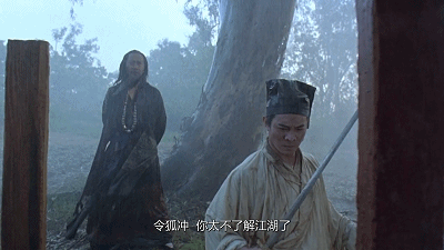 在程小東導演的電影《笑傲江湖之東方不敗》中, 令狐沖正打算帶著師弟們準備歸隱,從此不問江湖事,卻又被捲入江湖紛爭,師兄弟們幾乎全部喪命,掩埋好屍體後令狐沖難過至極。于此時,任我行對他說道:「只要有人,就有恩怨,有恩怨,就有江湖,人就是江湖,你怎麼退出啊?」