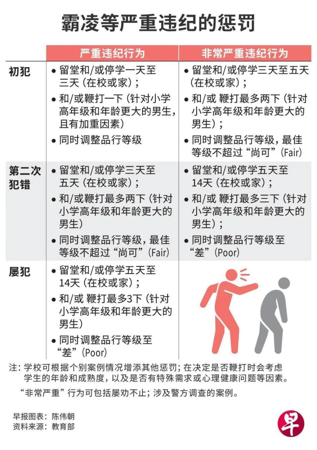 此外,教育部将列明学校处理霸凌等违纪行为的指导方针,包括统一惩罚方式。例如:依事件的严重程度,犯错学生可被留堂或停学,介于一天至14天,甚至鞭打。