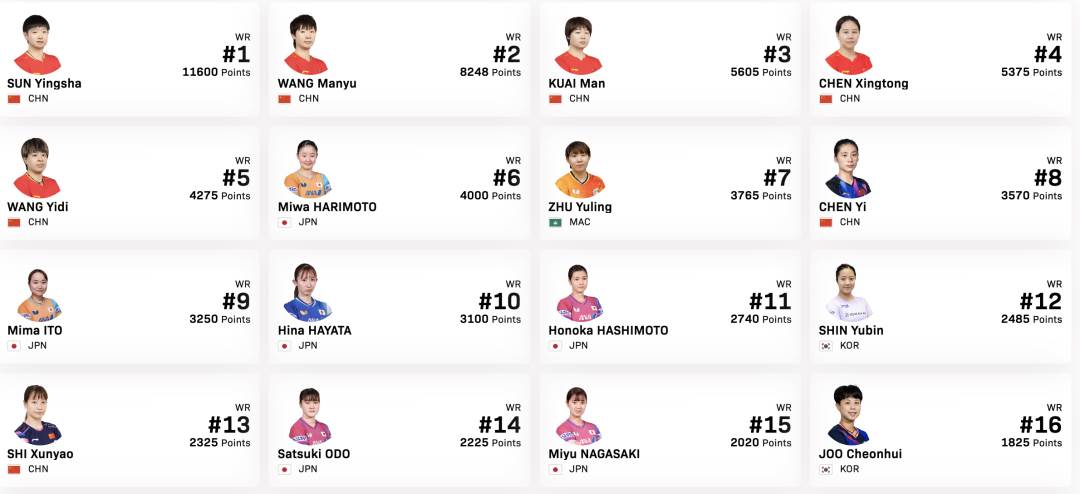 2026赛事部分 女选手名单 图源:WTT
