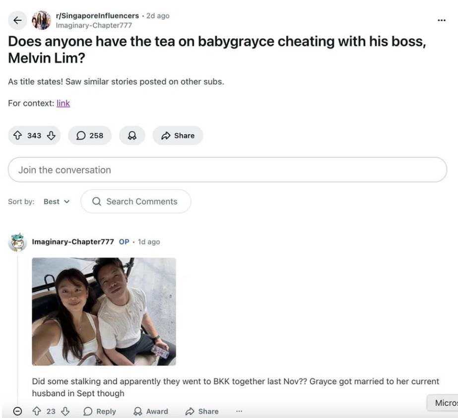 1月25日,Reddit 论坛 r/SingaporeInfluencers 上有用户发帖,猜测房地产经纪人梅尔文・林与网红谭恩美(格雷斯・谭)存在婚外情。梅尔文・林是房地产中介 PropertyLimBrothers 的联合创始人,谭恩美则是该公司的首席执行官、负责战略的副总裁。