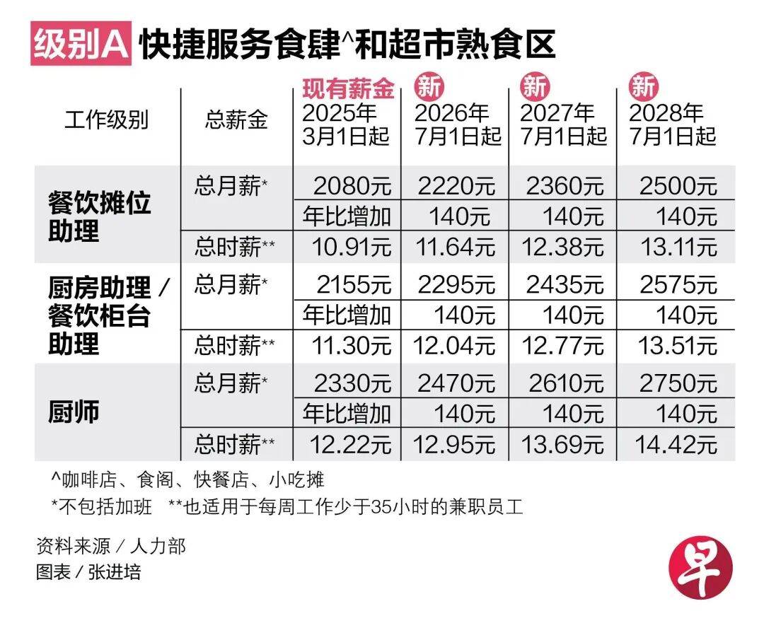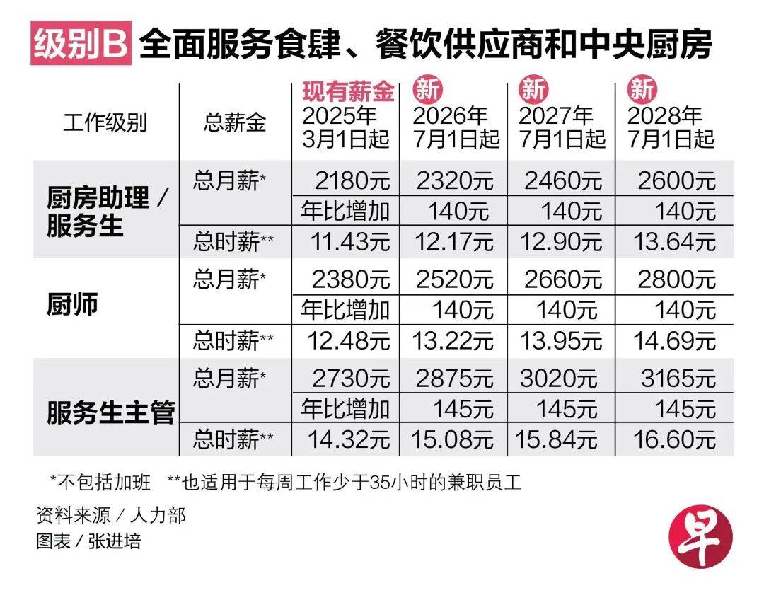 根据餐饮服务业劳资政工作组在3月16日公布的建议,本地餐饮业将继续推行渐进式薪金模式(Progressive Wage Model),餐饮业最低薪资标准将再次上调,预计约1万5000名全职员工今年将受惠。
