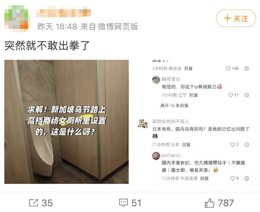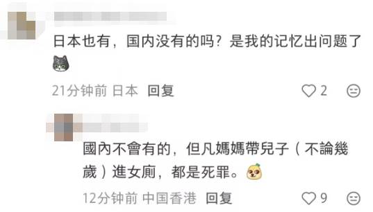 有网友表示,这种设施在国内可不会有,但凡妈妈带儿子进女厕,那都是“死罪”。