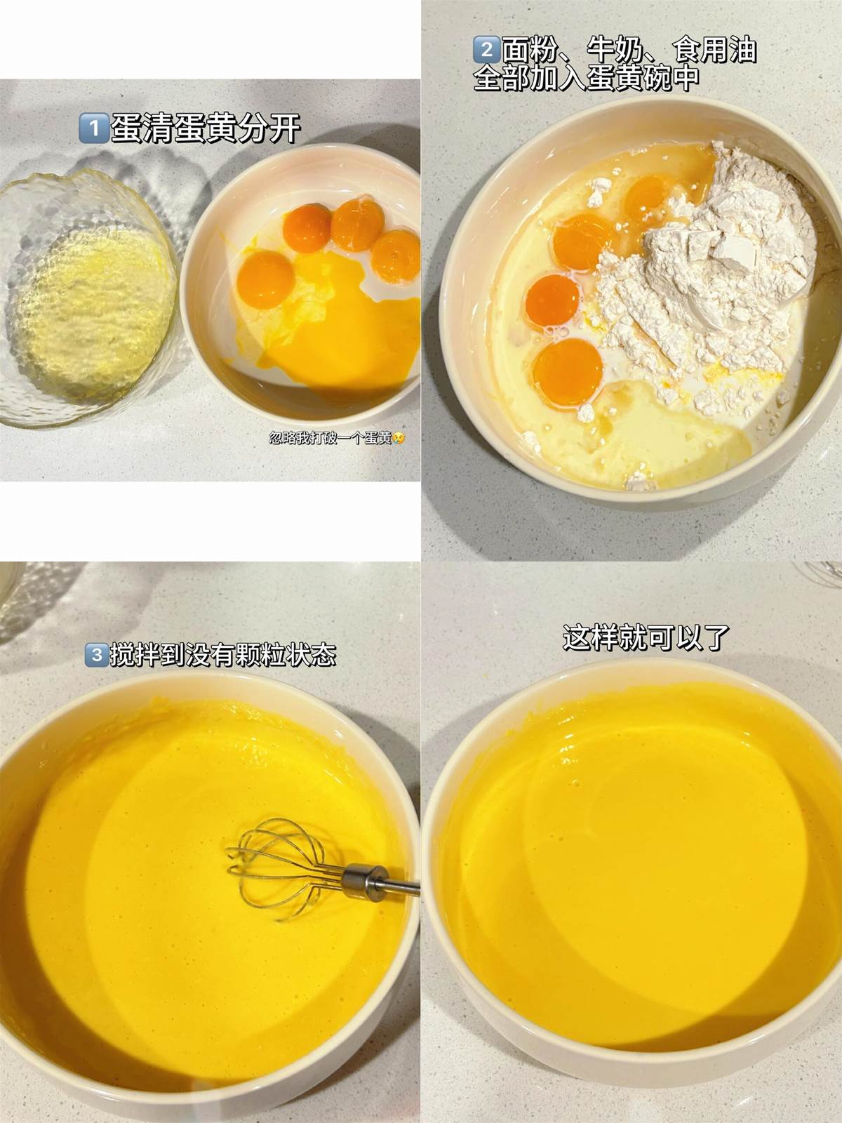 ?食材準備:1/3的食用油(最好是玉米?油)小半杯白糖,大半杯牛奶?一杯低筋麵粉,5️⃣個雞蛋?