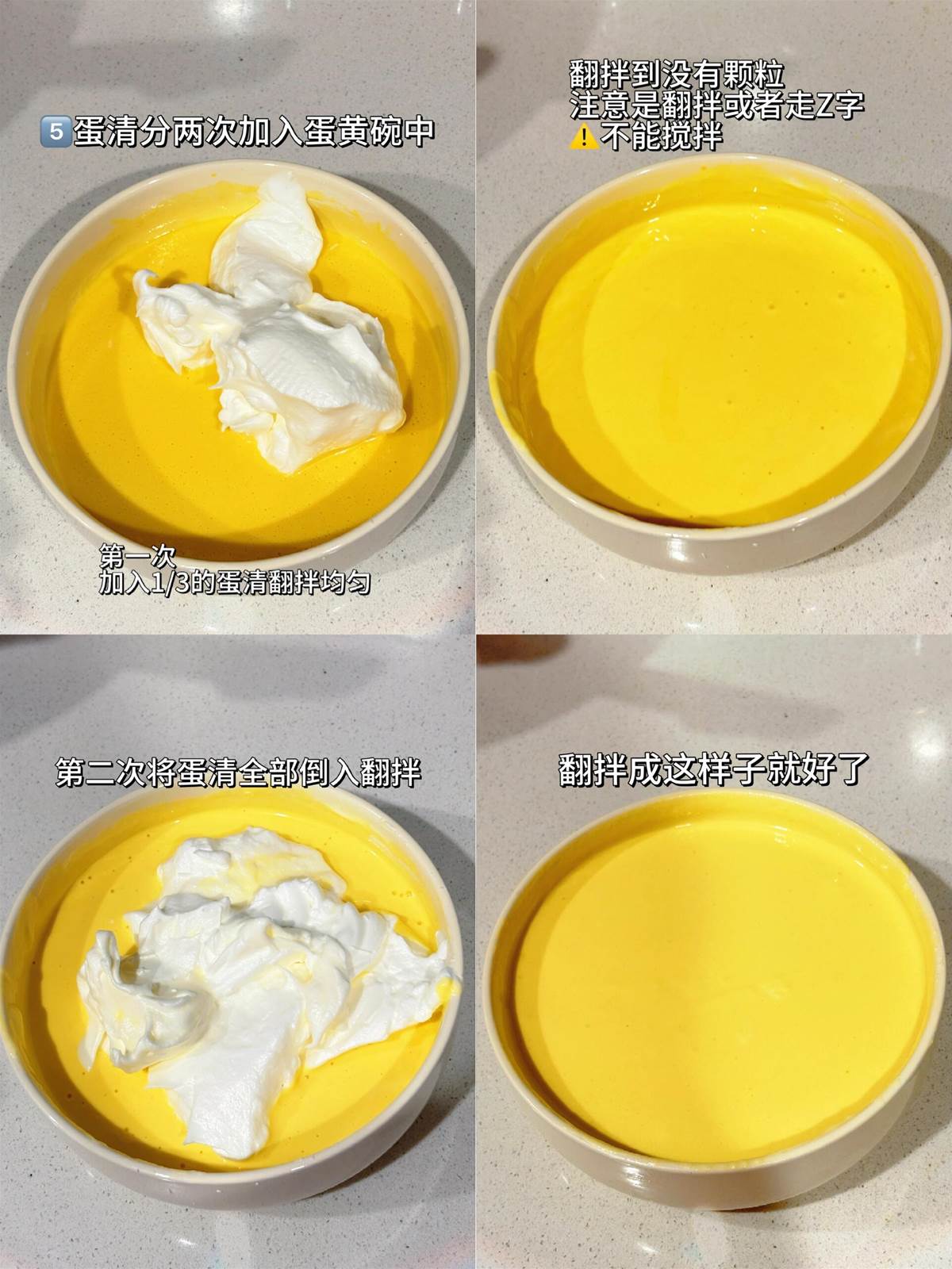5️⃣蛋清分兩次加入蛋黃碗?️,第一次加入1/3的蛋清?翻拌均勻即可。第二次將全部蛋清倒入蛋黃碗中翻拌均勻(⚠️這一步是需要翻拌❗️不能攪拌❗️)