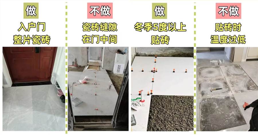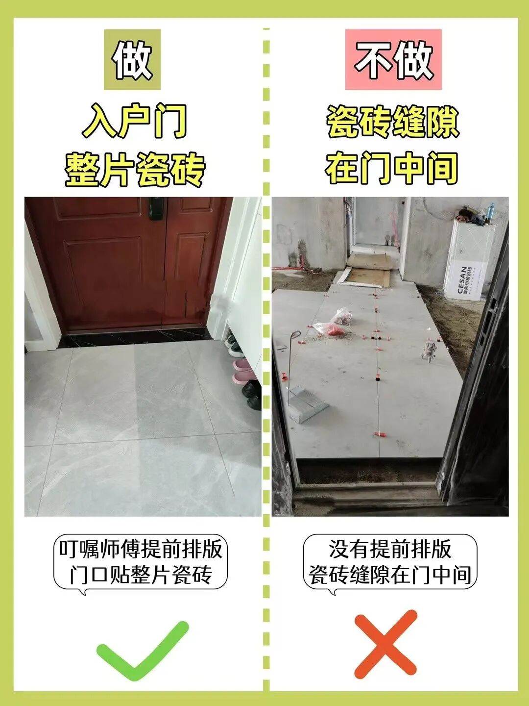 不要出現瓷磚縫正對著大門的情況,尤其是縫剛好對著大門中間,這對信風水的朋友來說是絕對不能接受的。要是裝成這樣,返工起來特別麻煩,所以咱自己得多上點心,提前就跟師傅叮囑清楚。