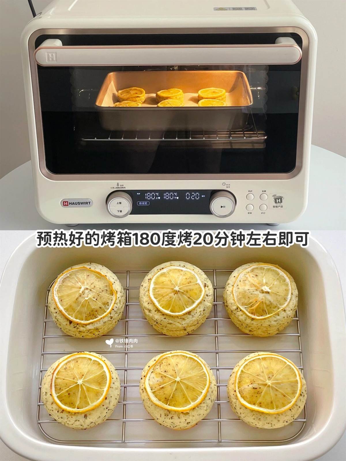 3⃣️麵糰用油紙包住搟成3公分左右的大圓餅,用模具壓出形狀,放入烤盤,上面放一層檸檬片。