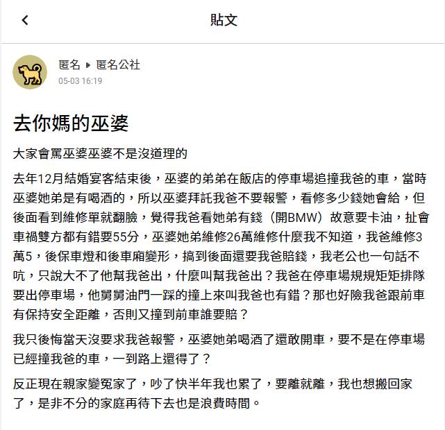 有網友在爆料公社發文,去年12月結婚宴客結束後,婆婆的弟弟在飯店的停車場追撞我爸的車,當時婆婆她弟是有喝酒的,所以婆婆拜託我爸不要報警,看修多少錢她會給,但後面看到維修單就翻臉,覺得我爸看她弟有錢故意多要費用,扯會交通事故雙方都有錯要55分,婆婆她弟維修26萬維修什麼我不知道,我爸維修3萬5,後保車燈和後車廂變形,搞到後面還要我爸賠錢,我老公也一句話不吭,只說大不了他幫我爸出,什麼叫幫我爸出?我只後悔當天沒要求我爸報警,要離就離,是非不分的家庭再待下去也是浪費時間。
