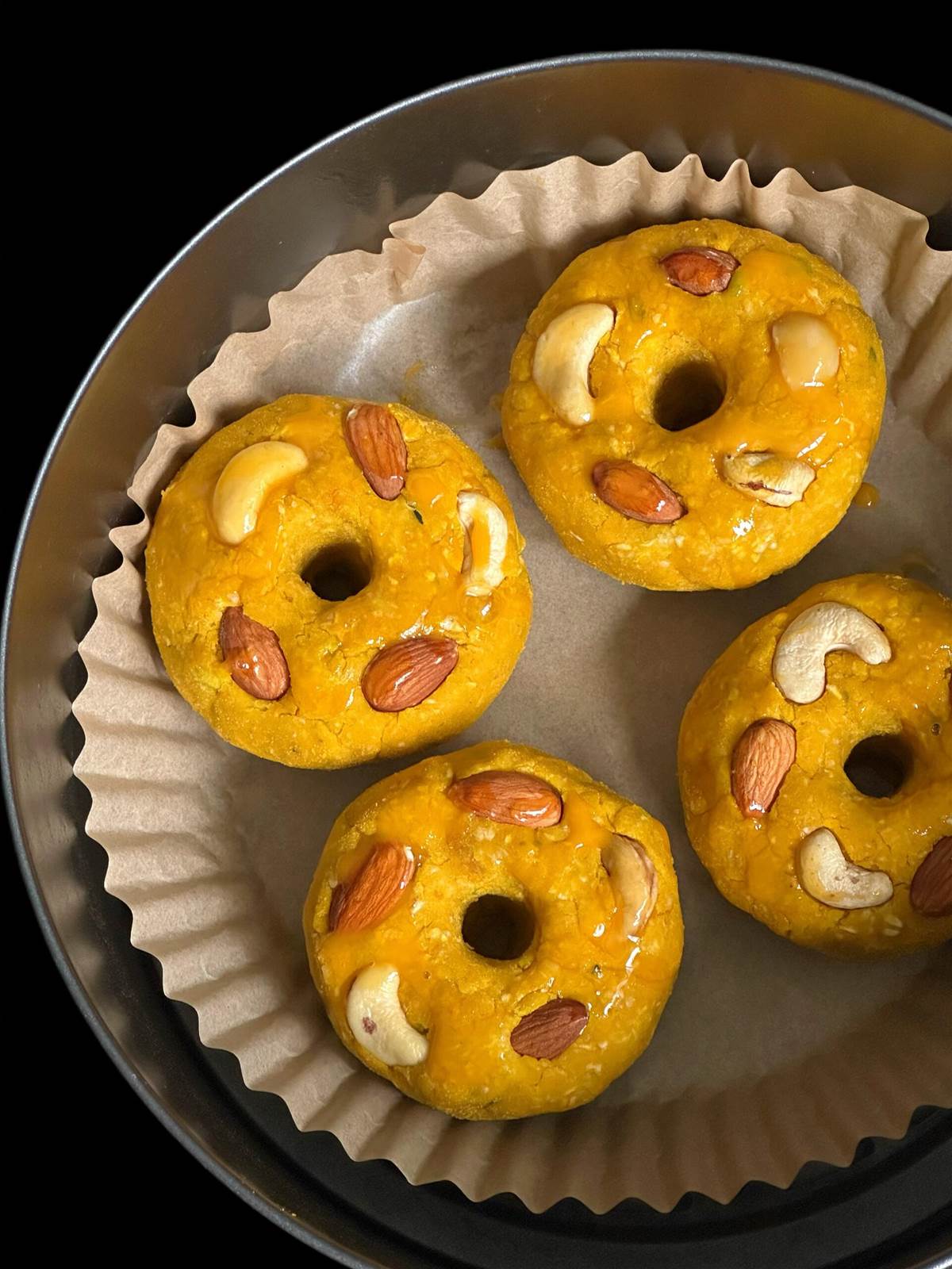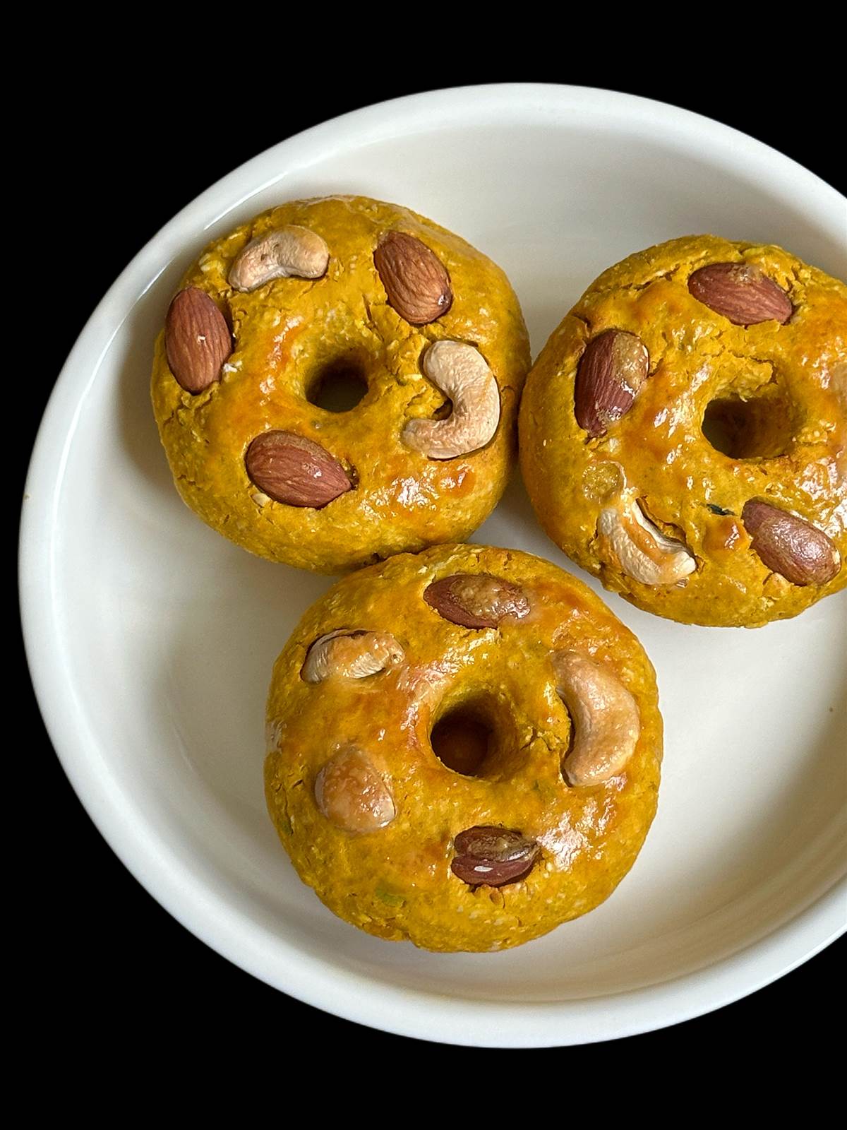 剛出爐的南瓜甜甜圈,金黃金黃的,表面點綴著香脆的堅果,顏值完全不輸外面賣的!湊近聞,全是南瓜的清甜混著堅果的焦香,沒有一點油膩感。