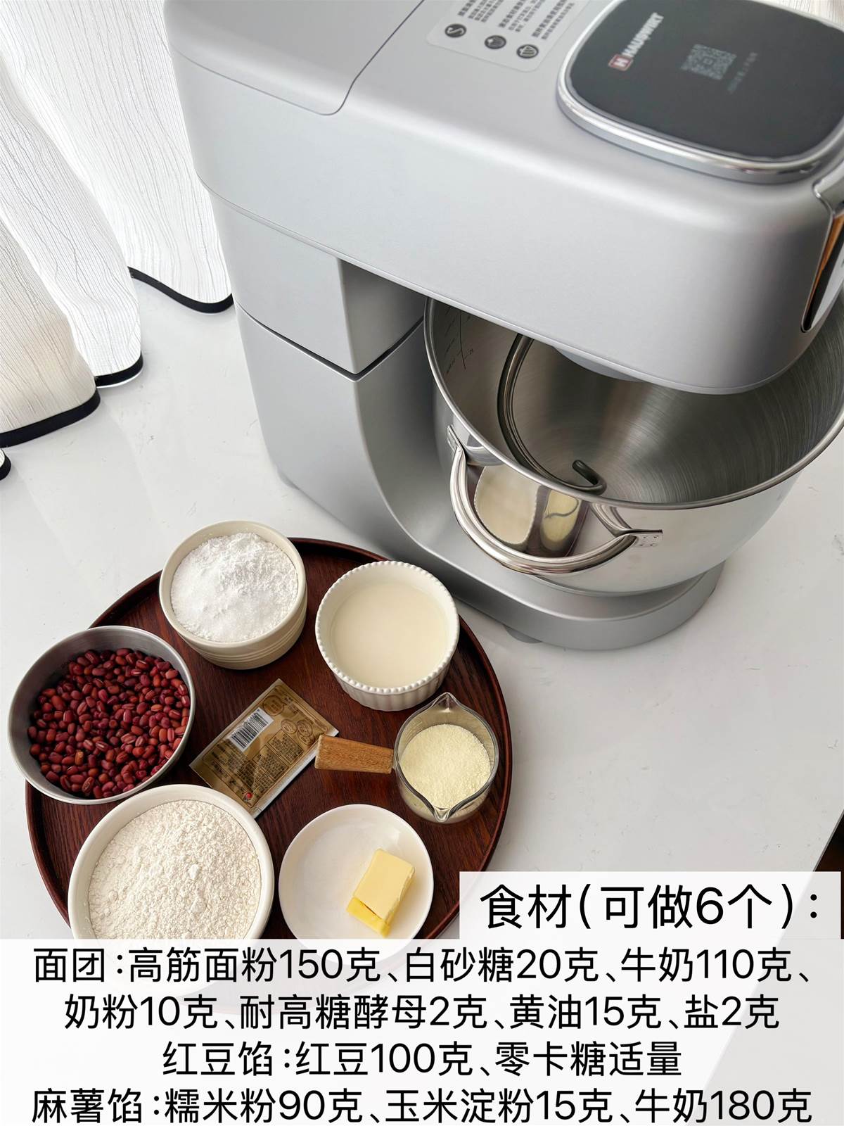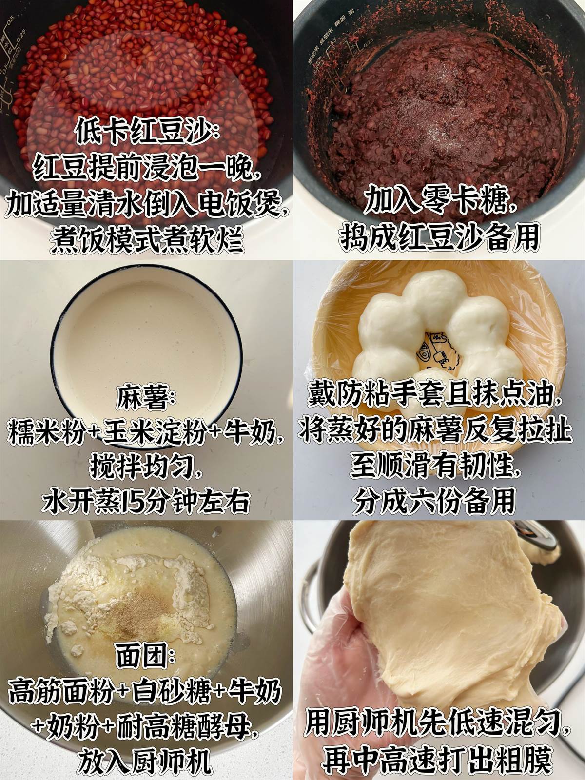 紅豆餡:紅豆100克、零卡糖適量 麻薯餡:糯米粉90克、玉米澱粉15克、牛奶180克