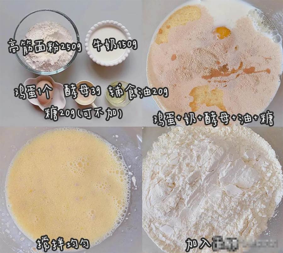高筋面粉250g、牛奶150g、輔食油20g、酵母3g、糖20g(別減太多,影響發酵)、雞蛋1個。