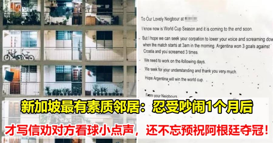 来自金文泰组屋的一位朋友就整整忍受了球迷邻居一个月的看球噪音!终于在阿根廷和克罗地亚的半决赛之后忍无可忍,在电梯里贴上了言辞恳切的一封信。