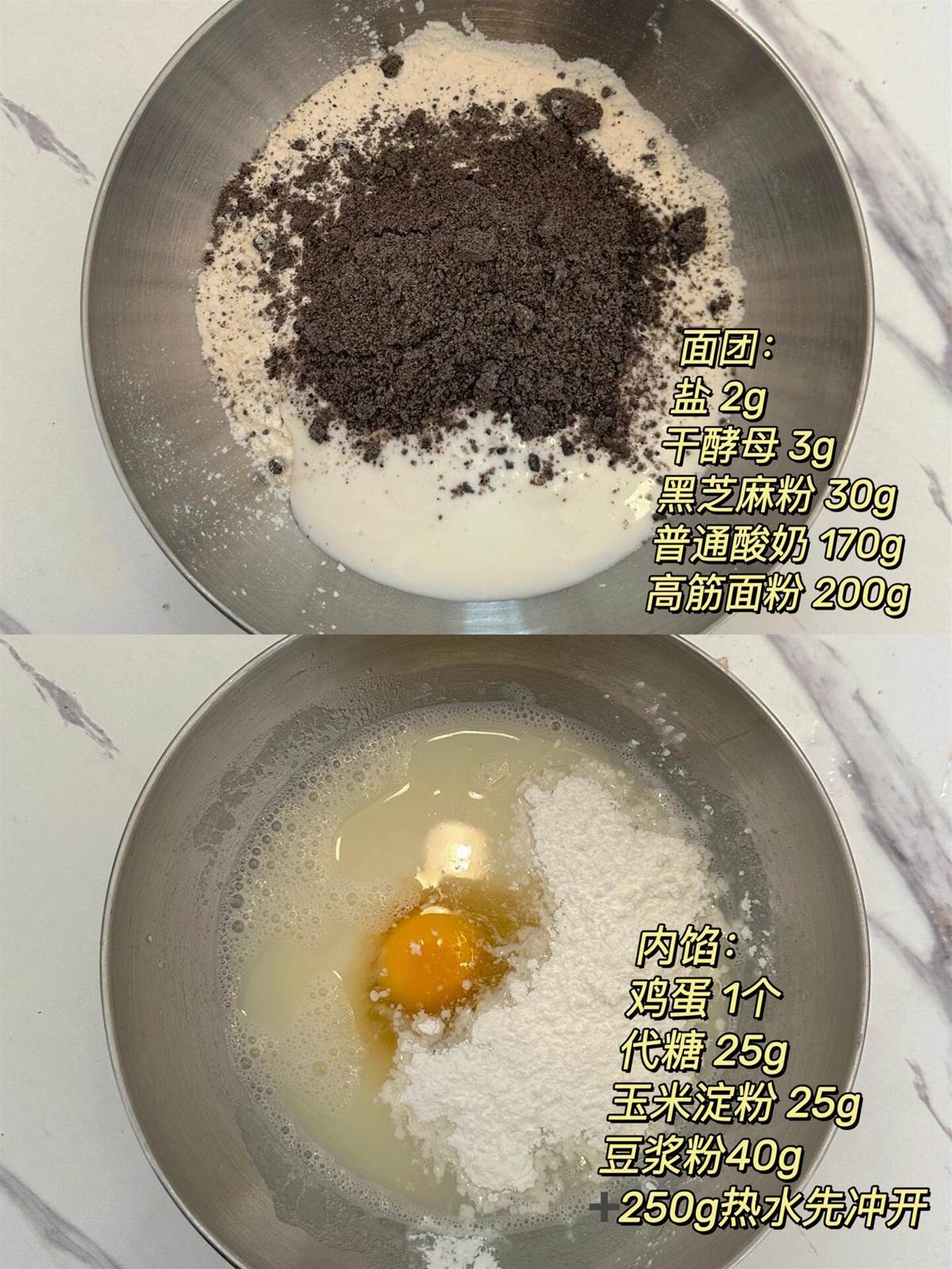 準備食材 麵糰部分 高筋麵粉 200g 普通酸奶 170g 黑芝麻粉 30g 乾酵母 3g 鹽 2g 內餡部分 豆漿粉 40g 250g 熱水(先衝開豆漿粉) 雞蛋 1 個 代糖 25g 玉米澱粉 25g 芝士片(可選,增加奶香味) ?? 製作步驟 1.