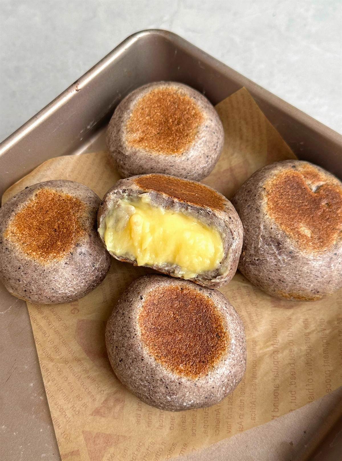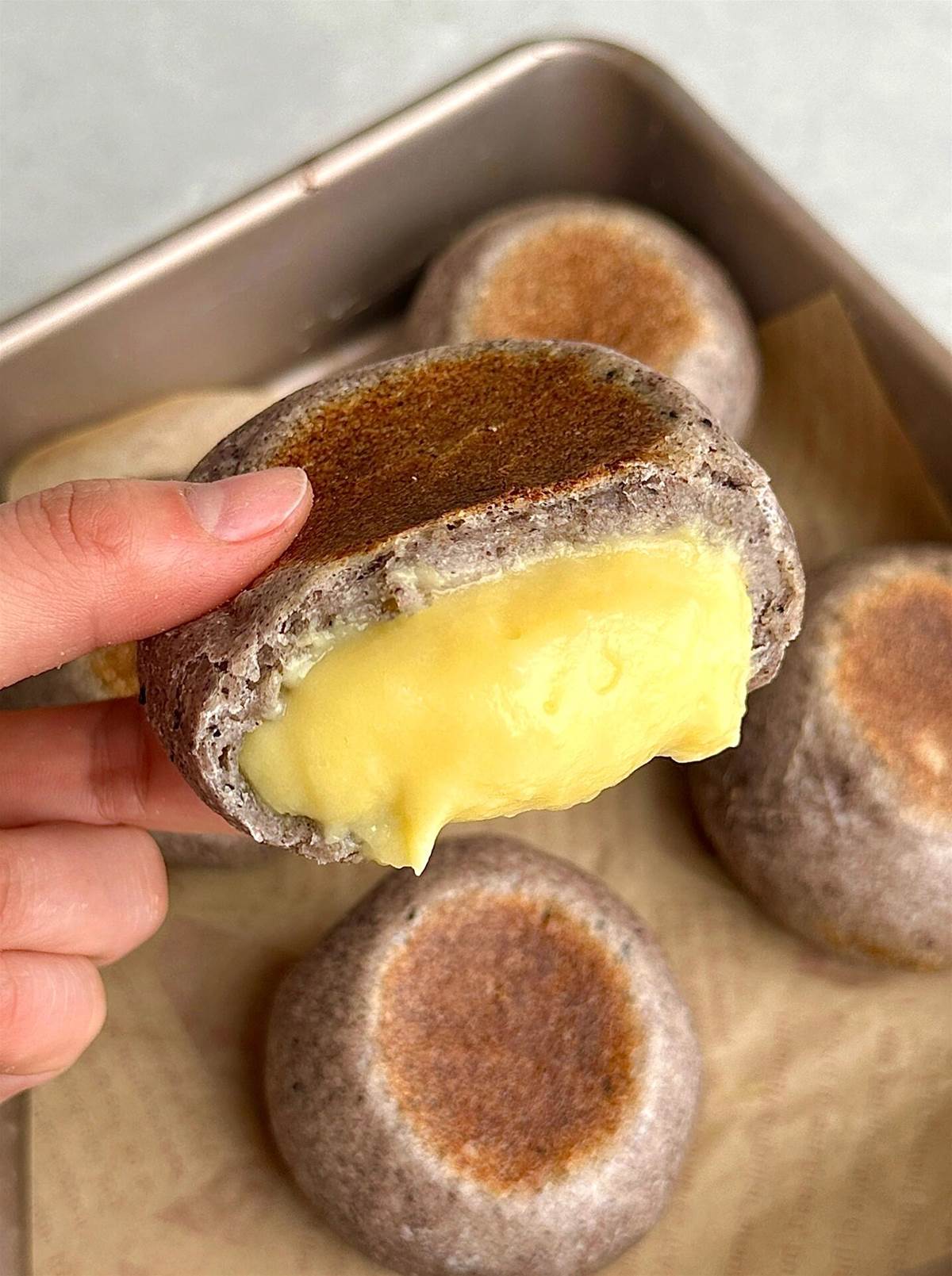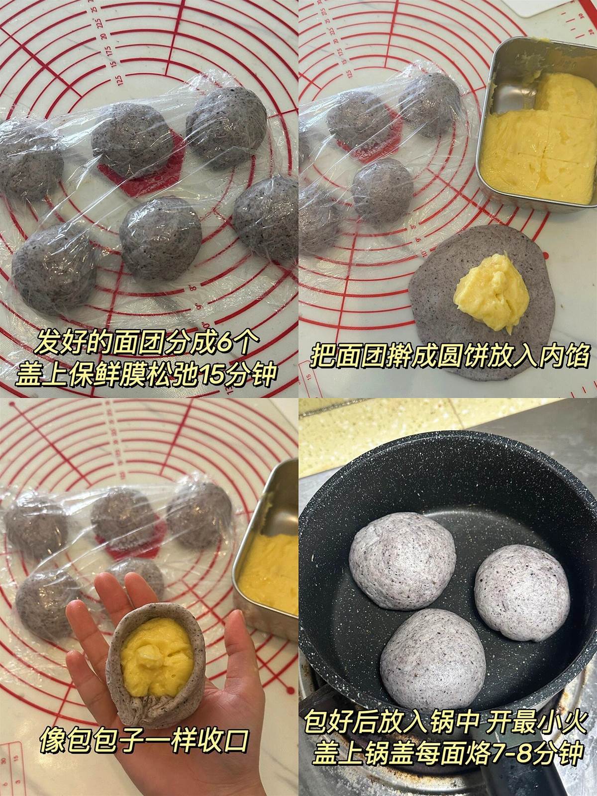 3. 包餡整形 發酵好的麵糰分成 6 等份,蓋上保鮮膜鬆弛 15 分鐘。 取一份麵糰搟成圓餅,放入冷藏好的內餡,像包包子一樣收緊口。 4. 烙制出鍋 包好的奶包放入平底鍋,開最小火。 蓋上鍋蓋,每面烙 7-8 分鐘,直到兩面金黃、按壓能回彈即可。