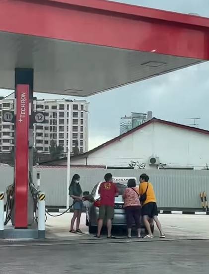 在曝光的视讯中,一辆新加坡轿车正停在添油站前方,一名年轻女子正在拿着油泵给汽车添油,而另外2个年轻男性和一名老妇人则站在汽车后面,双手用力的按压摇晃轿车。