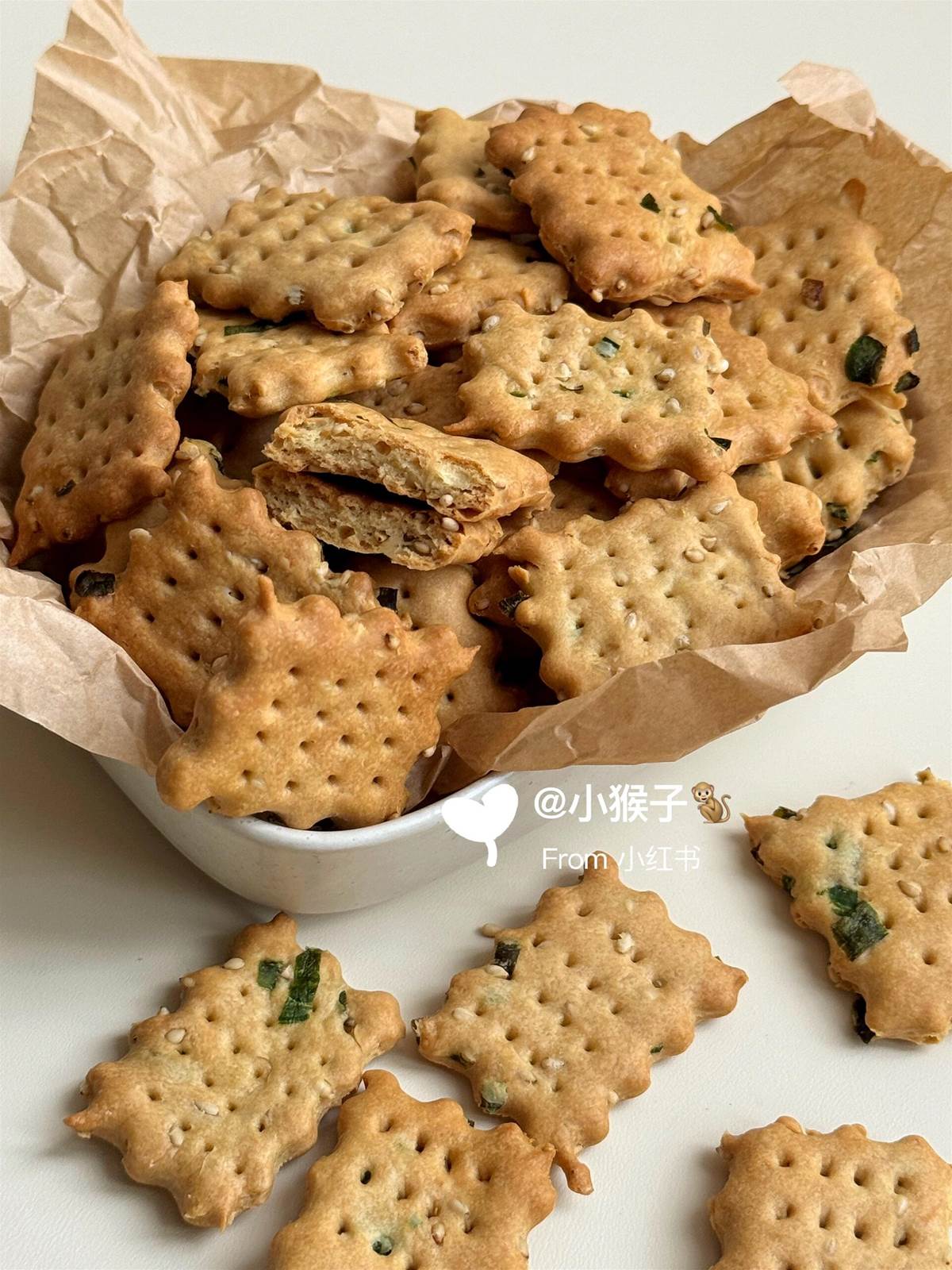 自制蔥香蘇打餅乾,剛出爐就香到飄滿整個廚房,咬一口「咔嚓」掉渣,濃郁的蔥香混著芝麻的焦香,鹹香入味,完全不齁,解饞的時候來幾塊,超滿足!