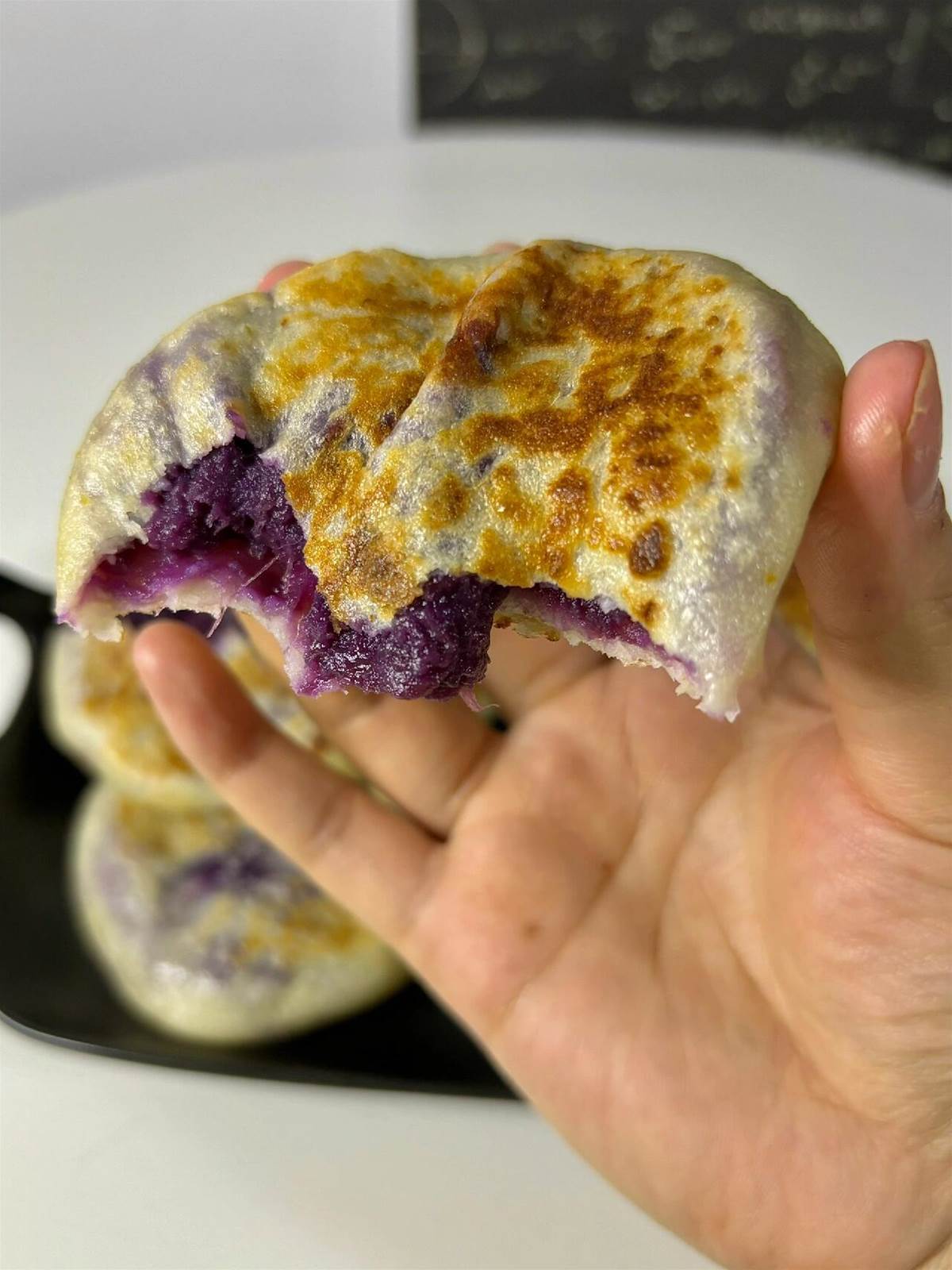 4️⃣ 包餡: 取一塊山藥麵糰按扁,放入紫薯球,捏緊收口再按扁。
