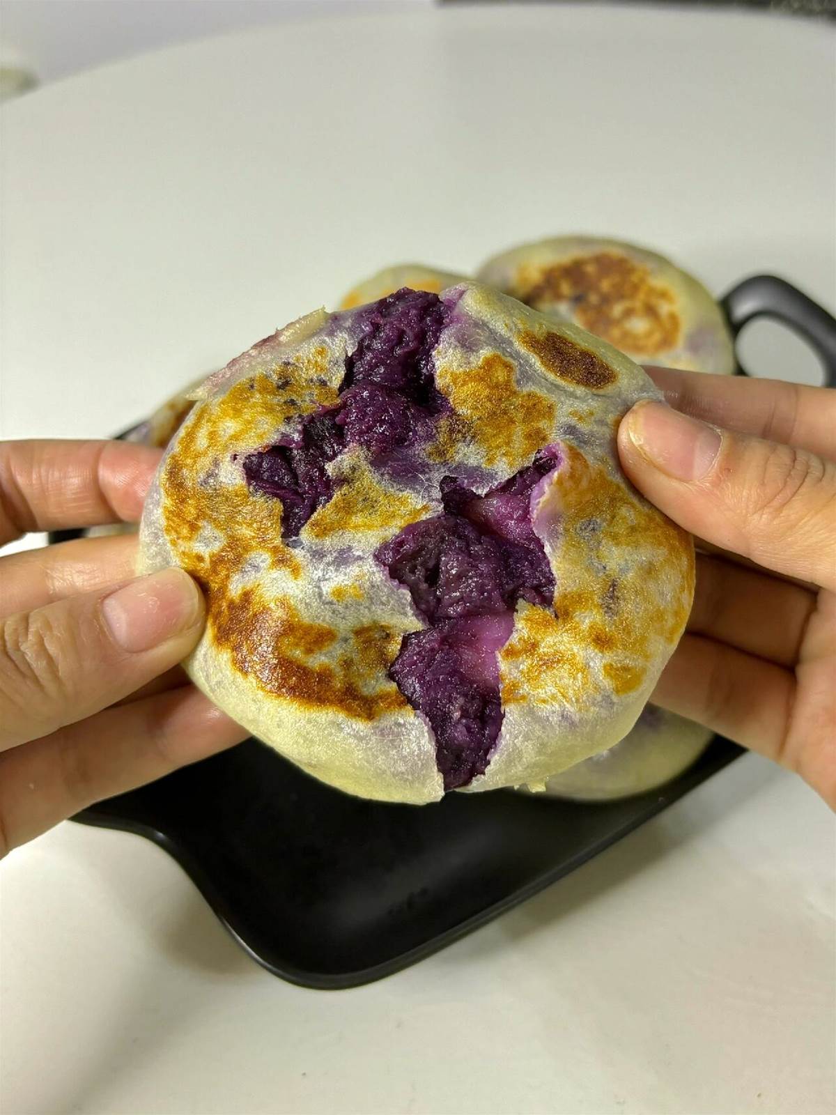3️⃣ 做餡: 紫薯加代糖壓成泥,也分成 6 等份搓圓。