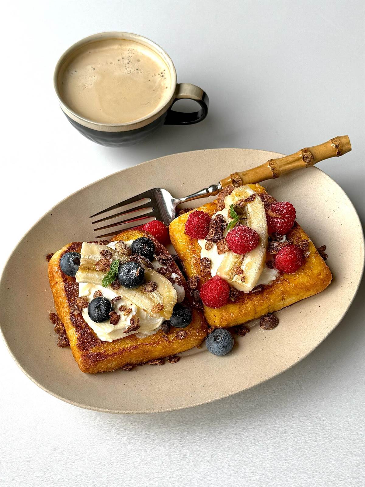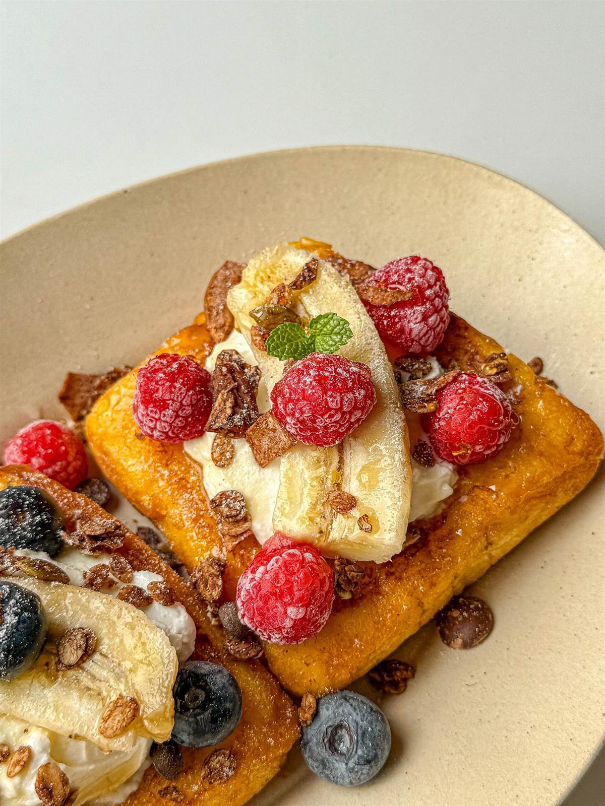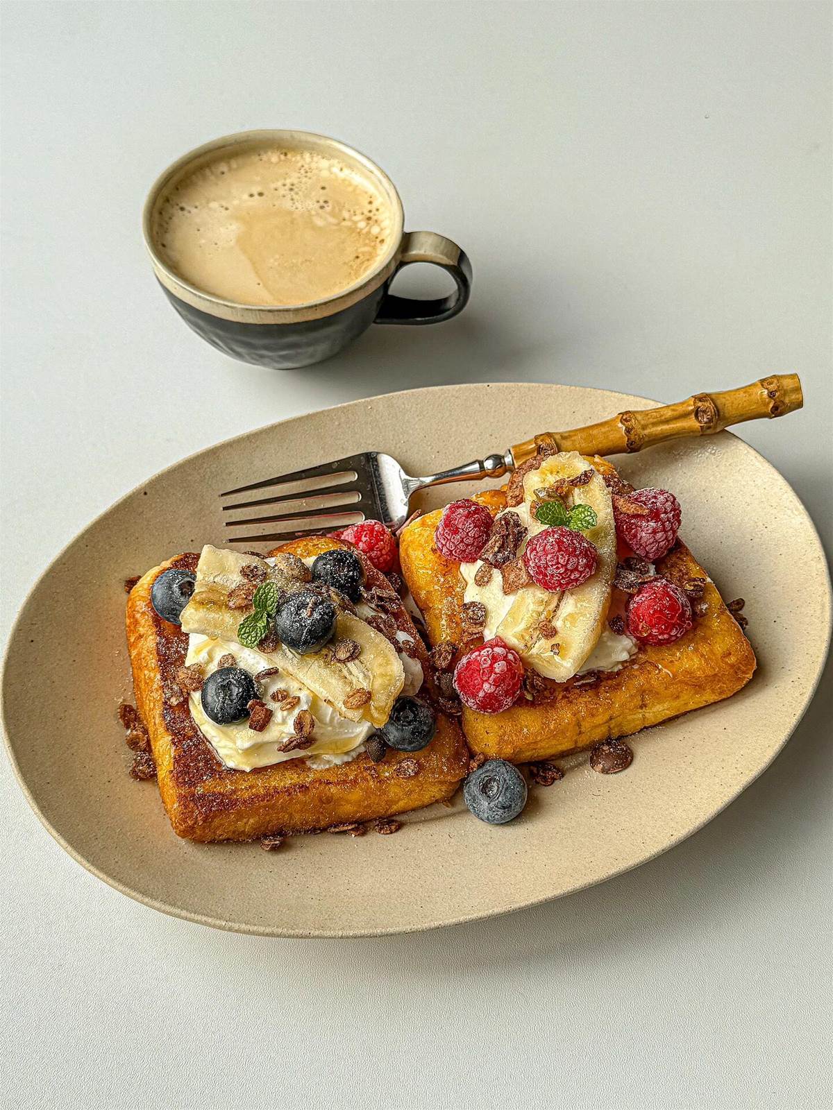 第三步:組裝 「藝術品」煎好的吐司鋪在盤子裡,先抹上一層厚厚的酸奶(代替奶油,更健康),然後碼上香蕉片和洗淨的莓果。