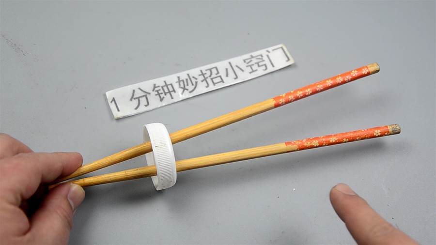 鑽好了之後,我們把筷子插到小孔裡面,這樣一個實用的小工具就製作完成了。下面讓我們一起來看看有哪兩個用途吧。