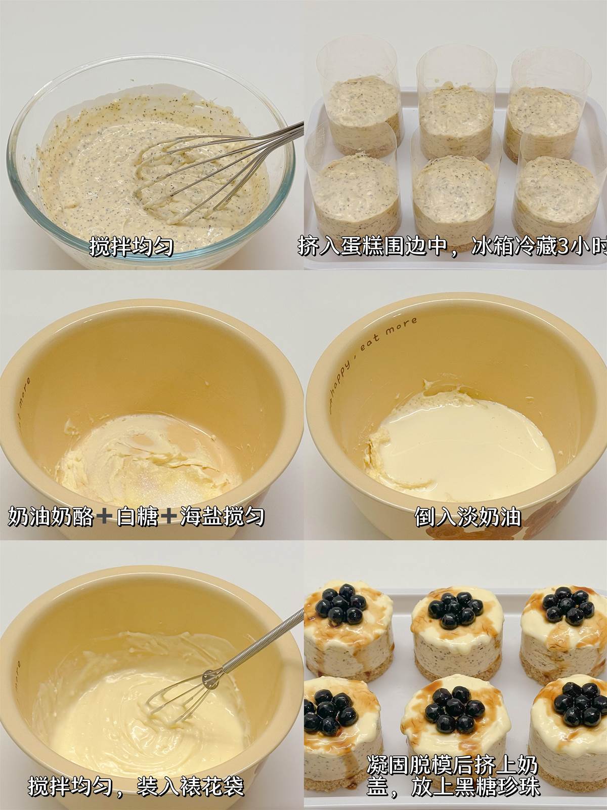 3️⃣軟化的奶油乳酪+白糖+海鹽攪勻,倒入淡奶油攪拌均勻,裝入裱花袋;芝士蛋糕凝固後脫模擠上芝士奶蓋,放上黑糖珍珠即可開吃。