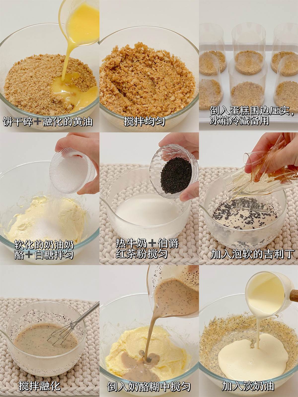 伯爵紅茶芝士: 奶油乳酪200g 白糖50g 熱牛奶50g 伯爵紅茶粉4g 吉利丁片8g 淡奶油160g