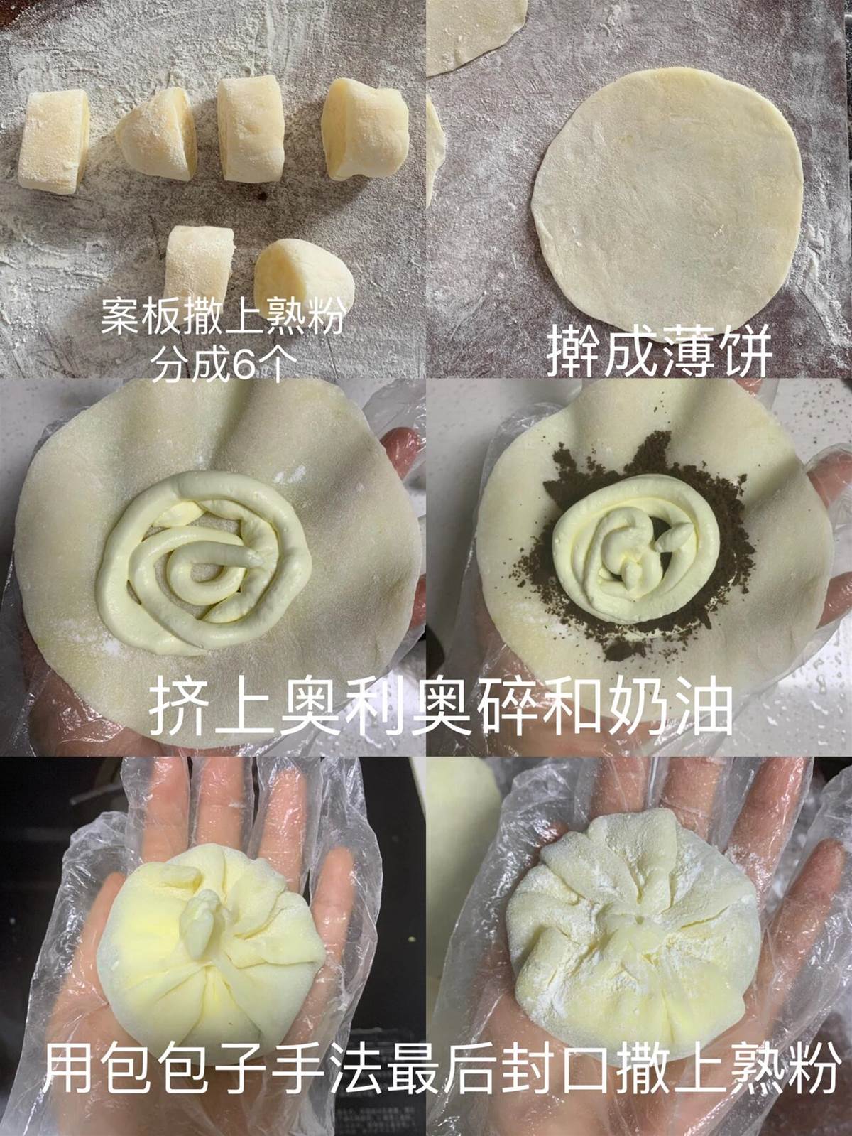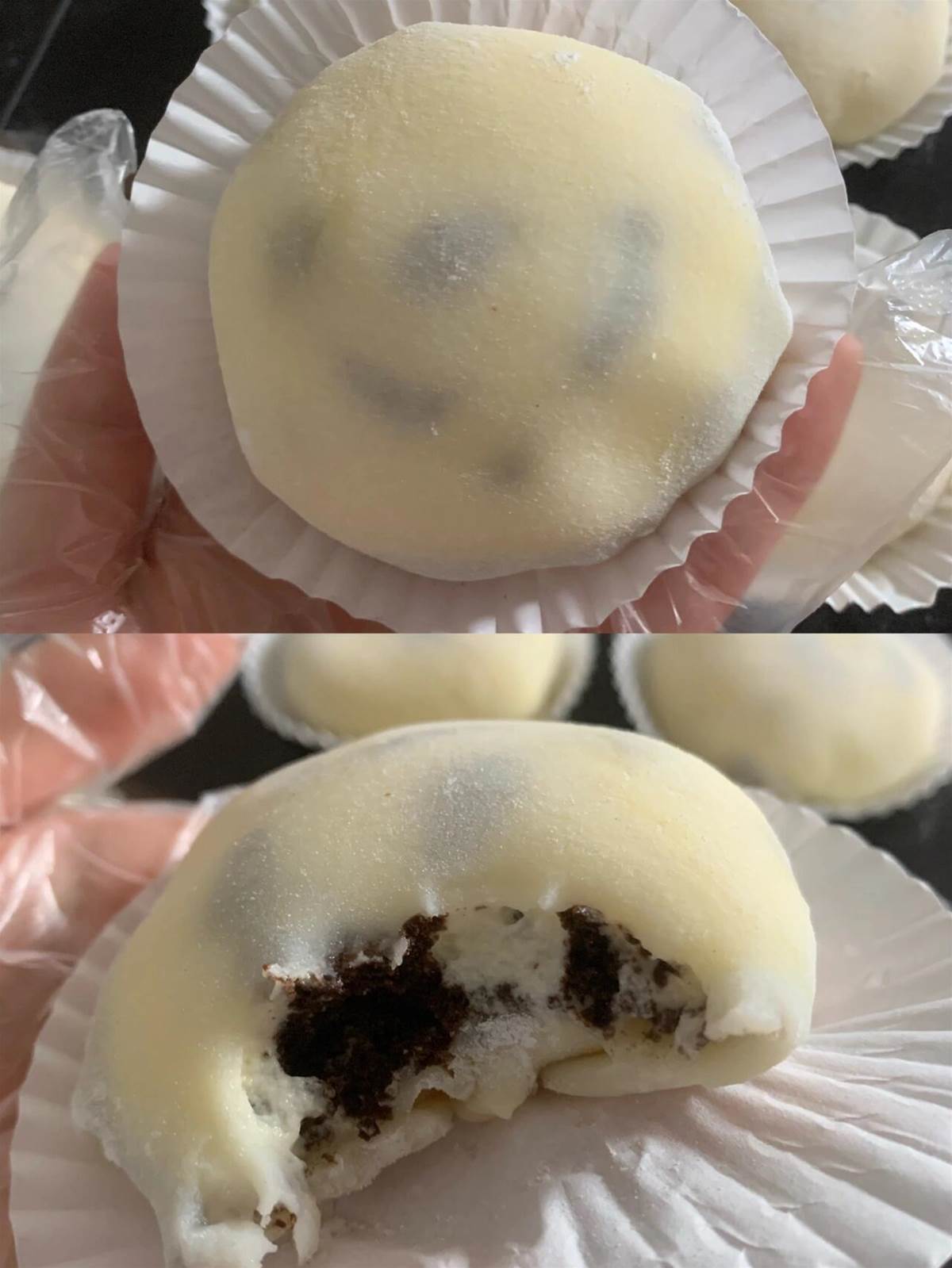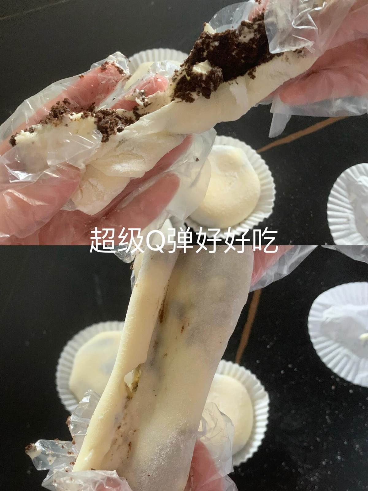 3️⃣120克淡奶油加10克糖打發至紋路,一層淡奶油一層奧利奧碎用包包子手法包好,收尾處撒上熟粉。 香甜軟糯的雪媚娘就做好了