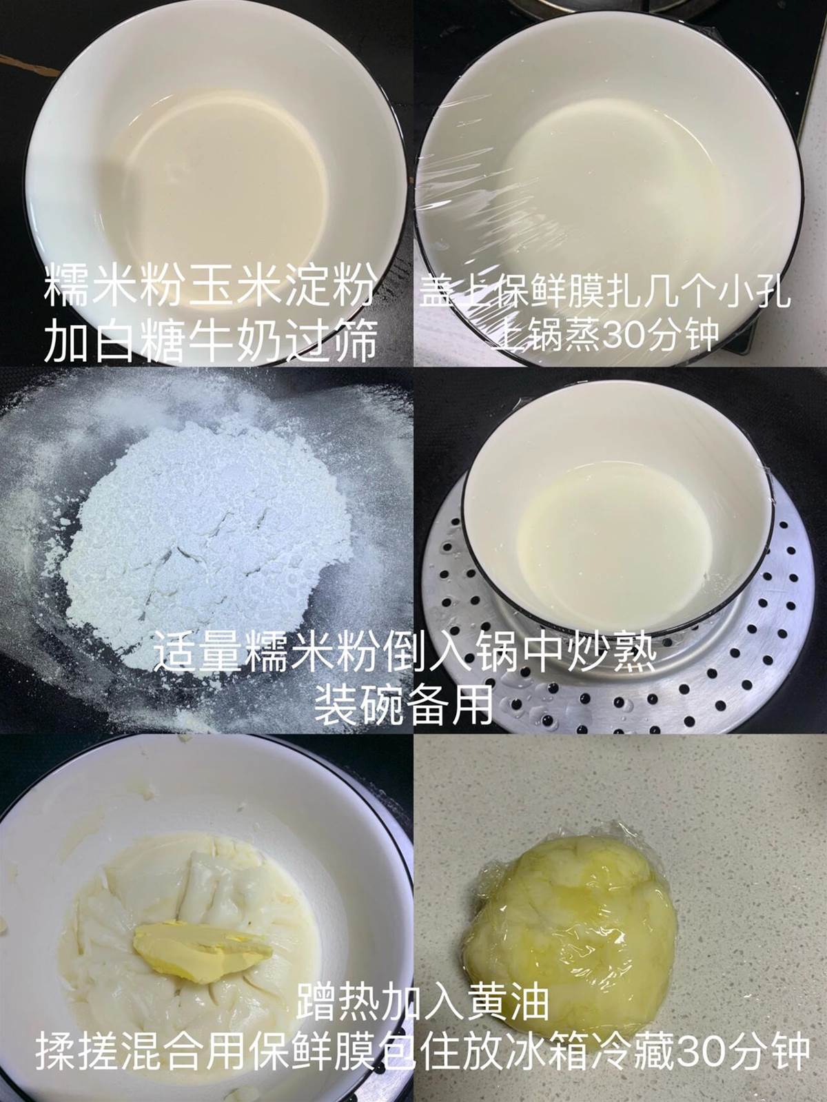1️⃣糯米粉加玉米澱粉牛奶白糖攪拌均勻過篩,蓋上保鮮膜扎幾個小孔,上鍋蒸30分鐘,趁熱放10克黃油揉搓均勻,用保鮮膜包好放冰箱冷藏30分鐘。