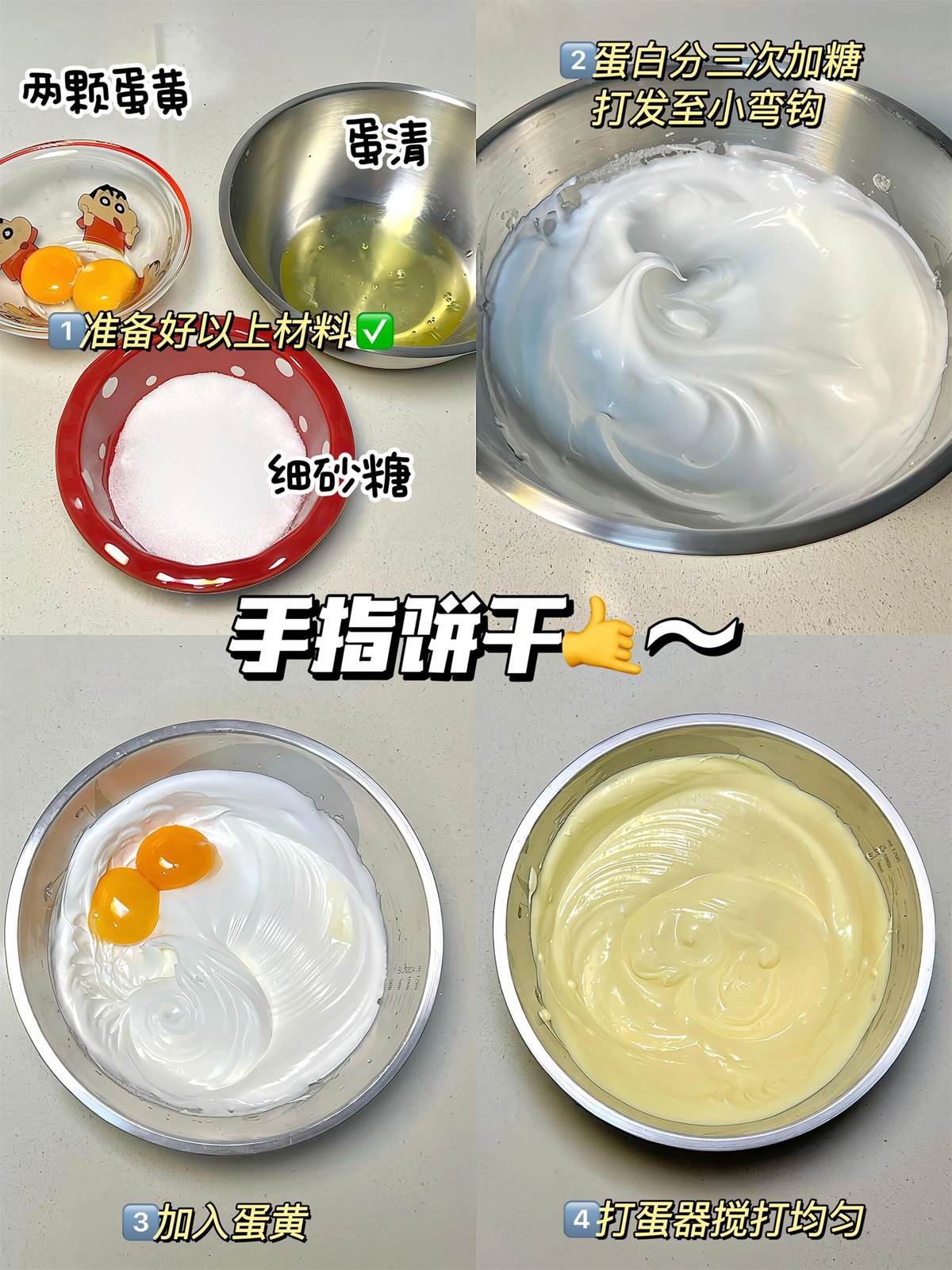 1️⃣雞蛋蛋黃蛋清分離,蛋清分三次加糖(魚眼狀大泡第一次,泡沫變細膩第二次,有紋路第三次)打發至小彎鉤狀