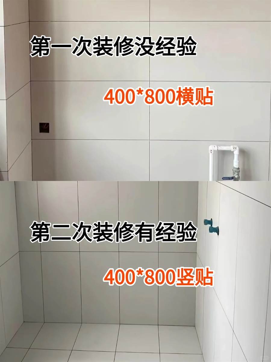 1️⃣ 400×800墻磚:別橫著貼,要豎著貼! 第一次裝修偷懶橫貼,顯得層高壓抑還呆板; 第二次豎著貼,視覺上拉高空間,衛生間廚房立刻顯高挑!