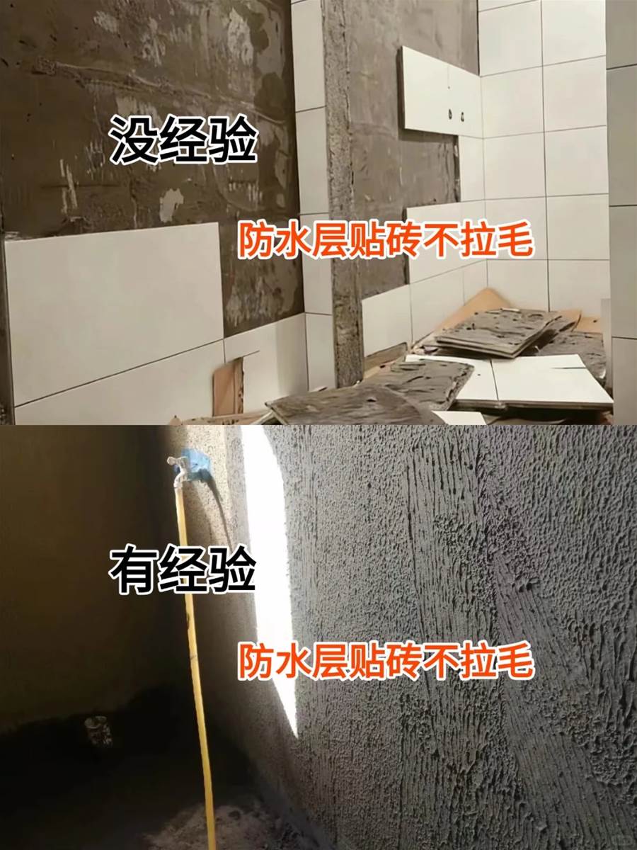 2️⃣ 防水層上貼磚:不拉毛=磚會掉!有一些地方冬天冷夏天潮,防水層光滑不拉毛,磚容易空鼓脫落; 做一層拉毛處理,增加抓力,貼完十年都不帶掉的~