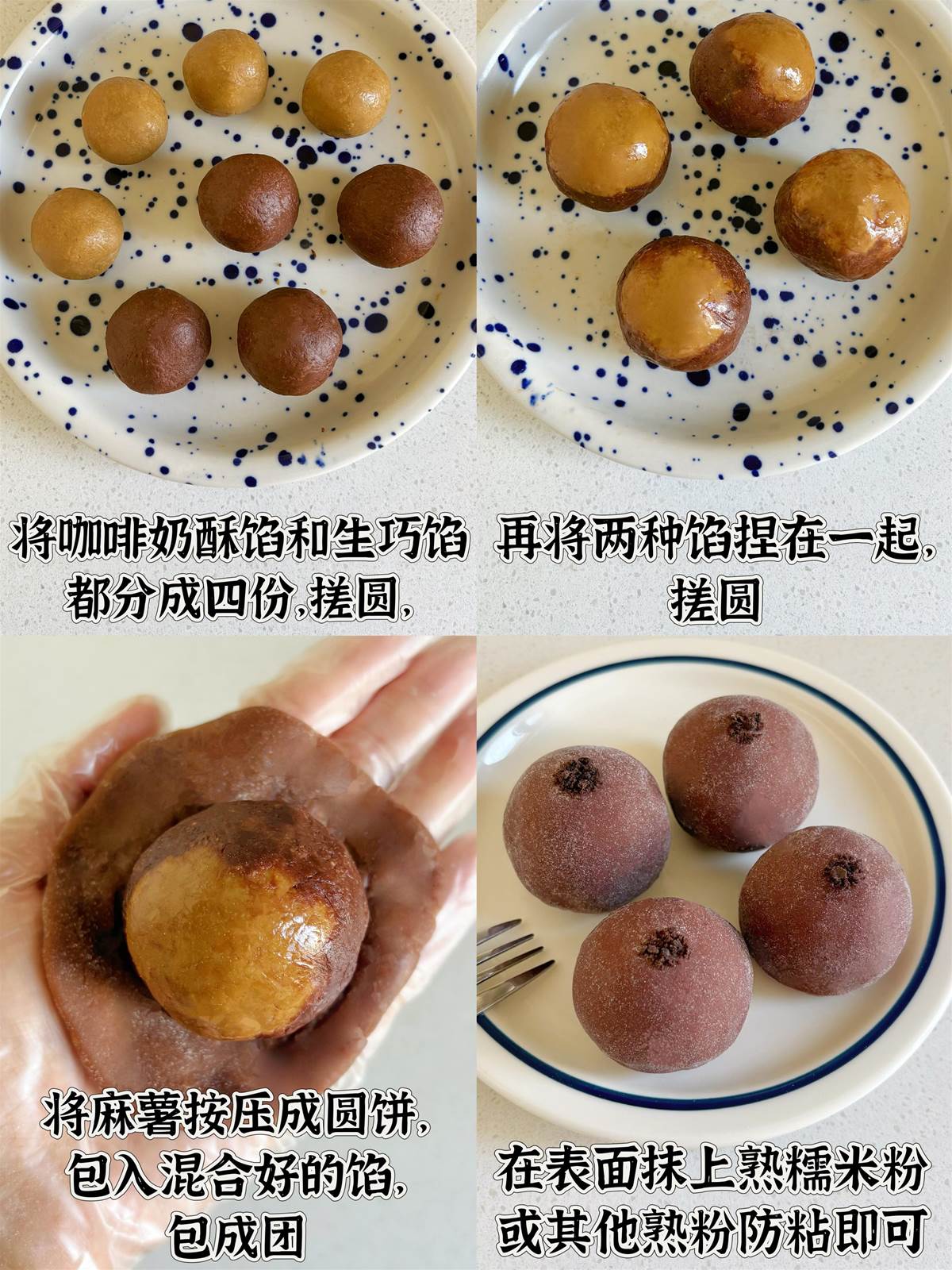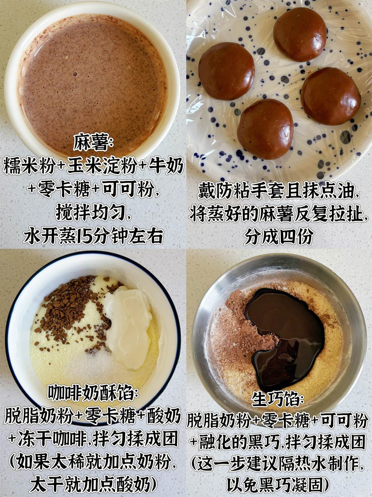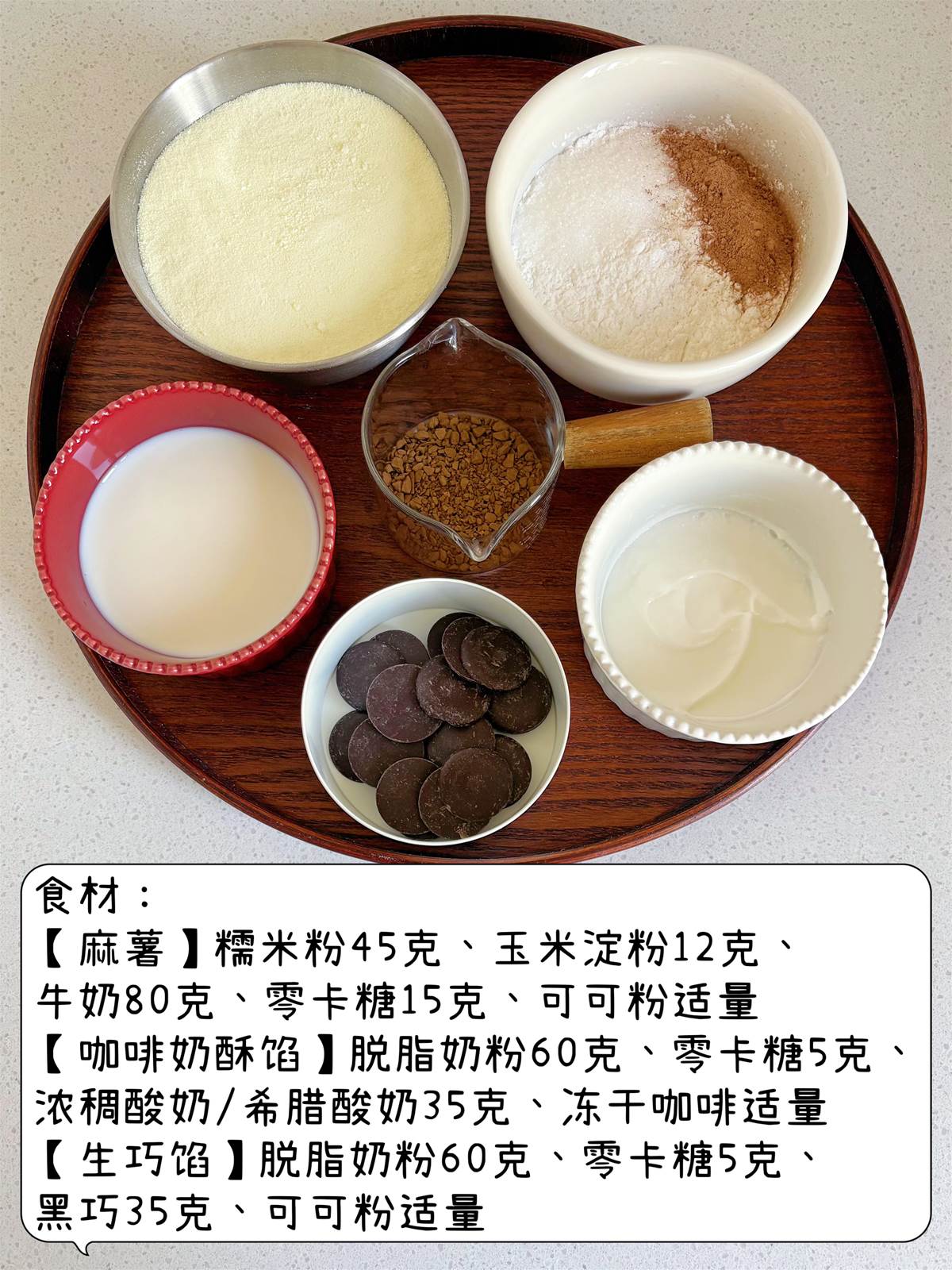 麻薯:糯米粉45克、玉米澱粉12克、牛奶80克、零卡糖15克、可可粉適量咖啡奶酥餡:脫脂奶粉60克、零卡糖5克、濃稠酸奶/希臘酸奶35克、凍幹咖啡適量