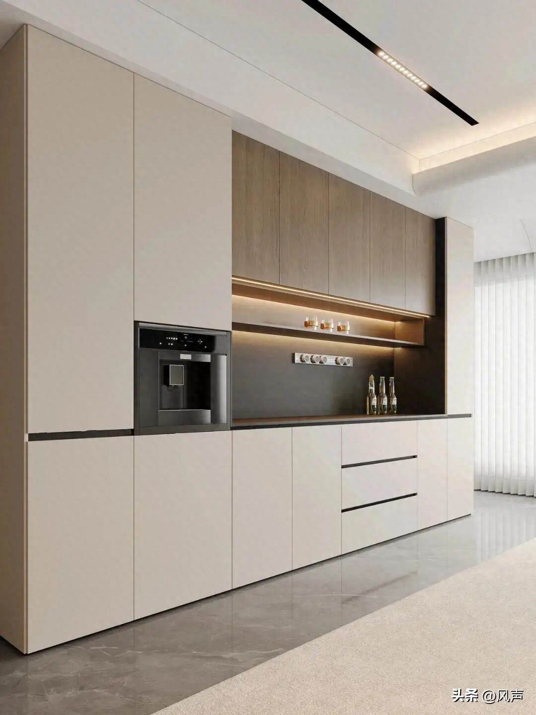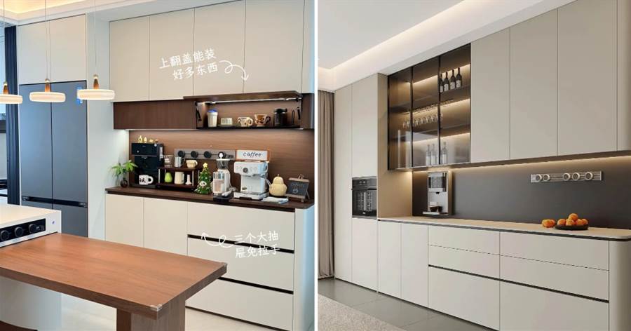 柜體選同材質、同色系,比如原木色+白色、深灰色+金屬線條,避免顏色、材質混亂;線條走簡約路線,免拉手或暗拉手設計,減少視覺雜亂,讓整體更協調。