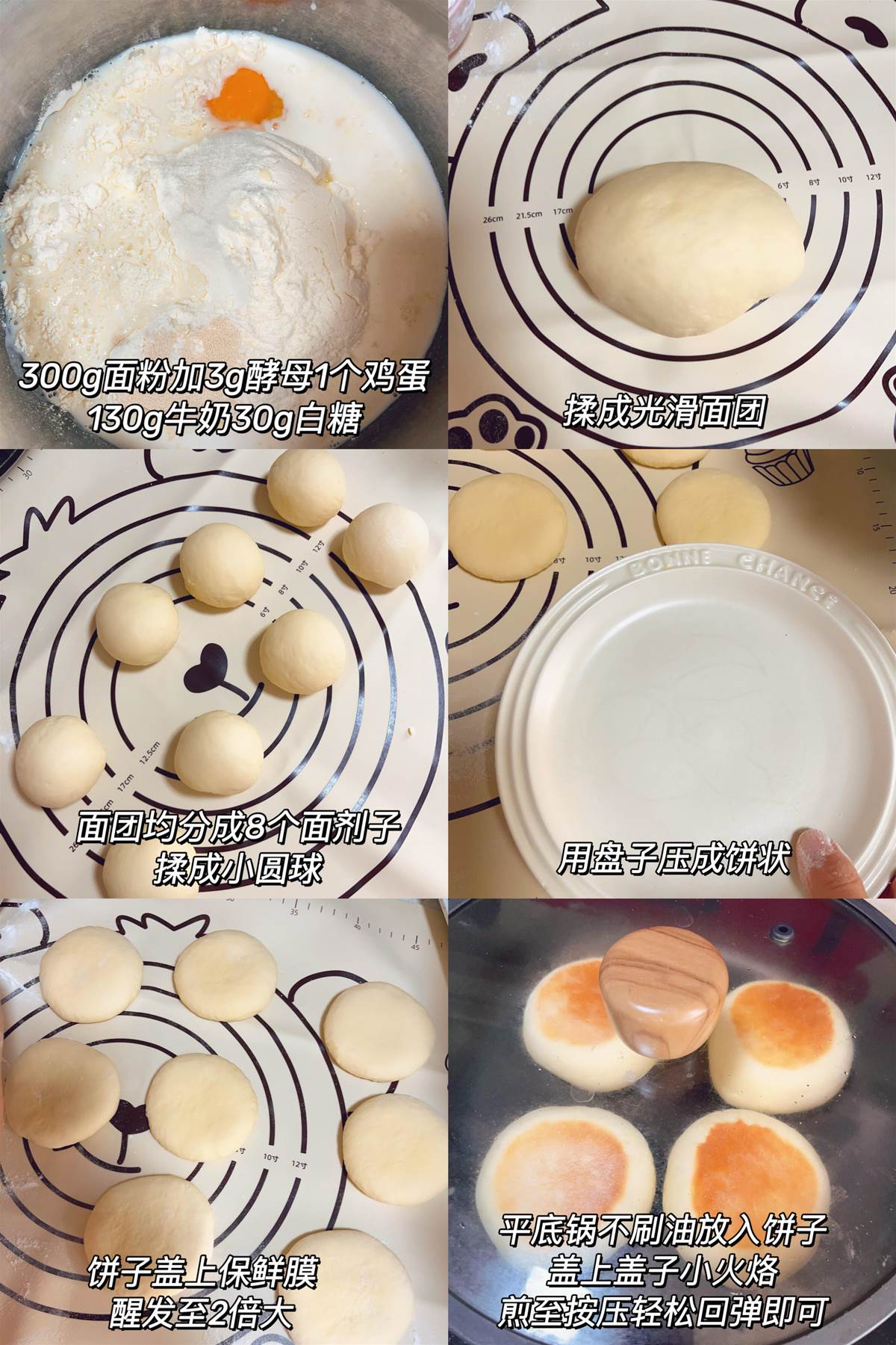 4⃣️平底鍋不用刷油,放入餅子蓋上蓋子小火慢慢烙,烙至兩面金黃按壓餅子輕鬆回彈即可
