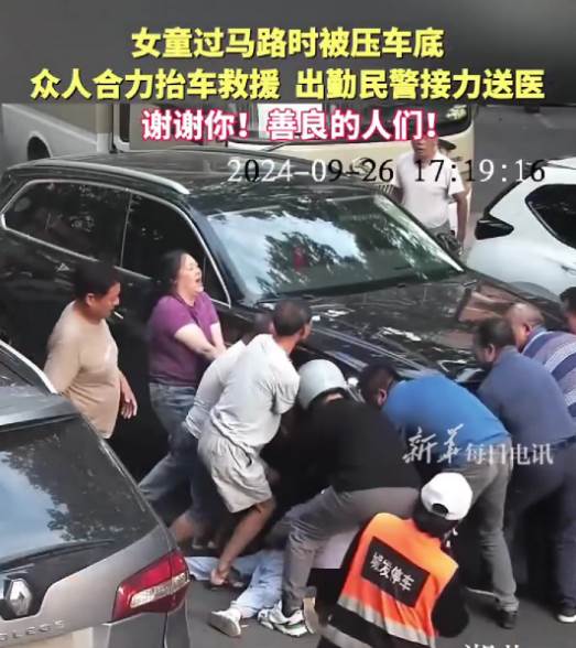 周圍的行人一片驚呼,所有人都停下了腳步,目光瞬間聚集在這驚險的一幕上。司機驚慌失措地從車上跳下,試圖檢查女童的情況,然而他一個人無論如何也無法將車抬起。
