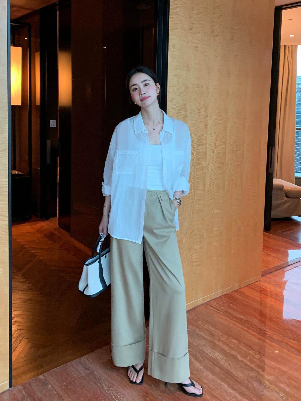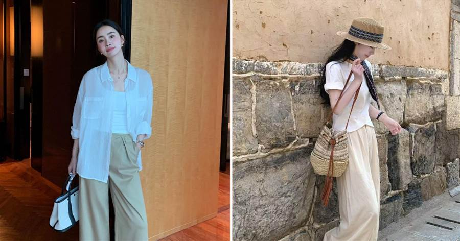 卡其色成熟穩重,白色清爽減齡,簡直就是最佳拍檔!卡其色闊腿褲搭配白色薄襯衣,疊搭白色修身吊帶,顯瘦又有氛圍感。