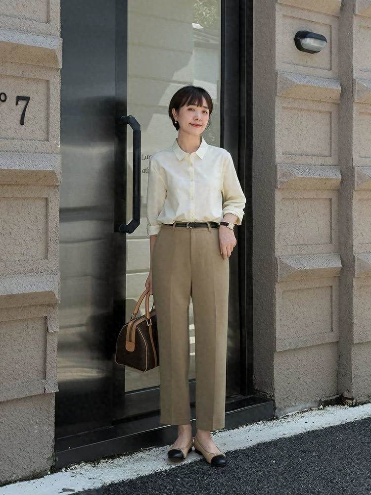 當直筒版型的卡其褲,邂逅基礎款白襯衣,光是配色就足以令人心動,簡約而又大氣的色彩,不挑剔膚色,還很抬氣質。