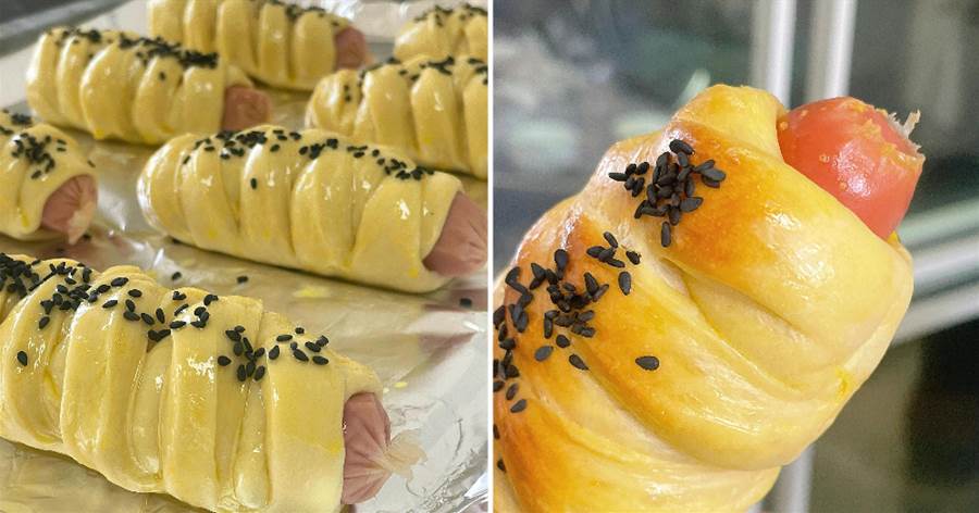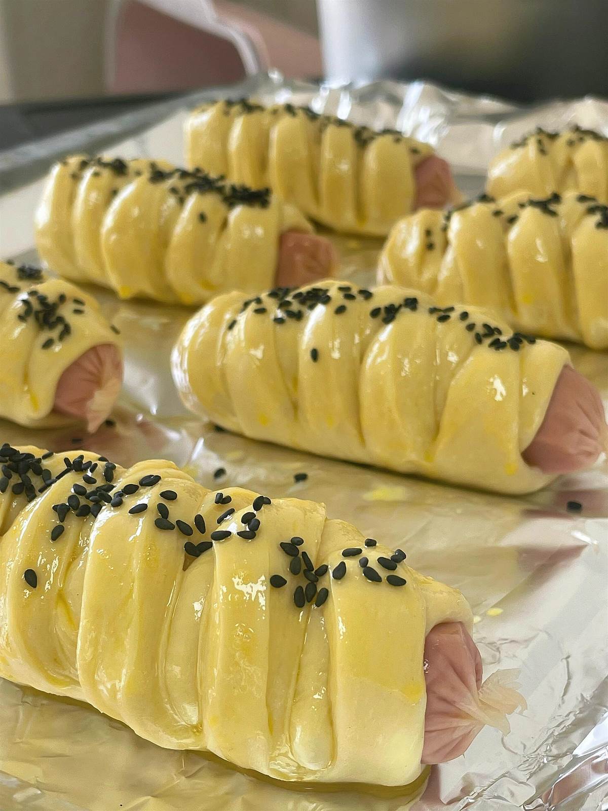 高筋面粉 280g | 奶粉 15g | 白糖 20g | 雞蛋 1 個耐高糖酵母 3g | 水 120-130g(或牛奶 130g)黃油 30g | 鹽 3g | 熱狗腸 8 根表面裝飾:全蛋液 + 黑芝麻