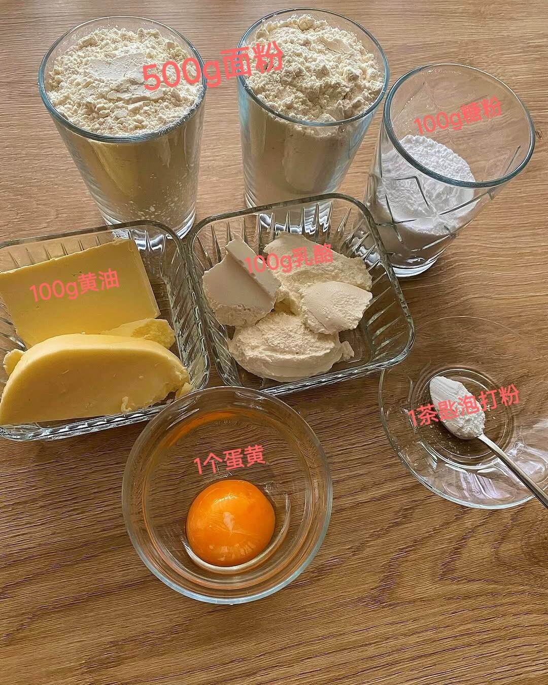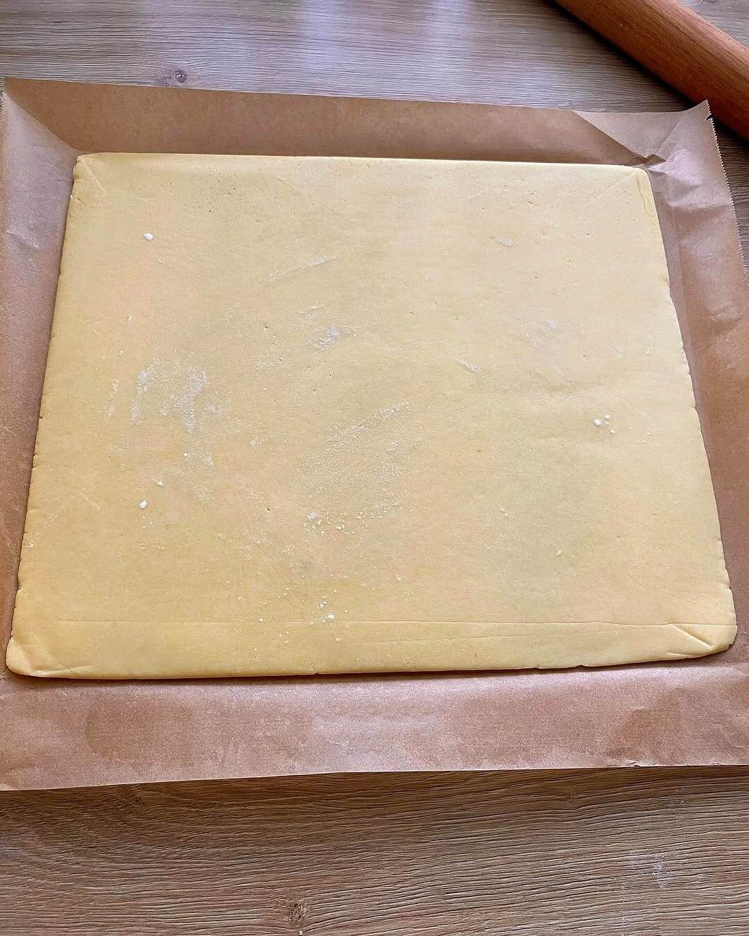 麵糰部分:100 克 黃油(冷的,切成小塊)、100 克 可塗抹的乳酪、1 個 蛋黃、2 杯 麵粉(約500克)、1 茶匙 泡打粉、1/2 杯 糖粉(約100克)