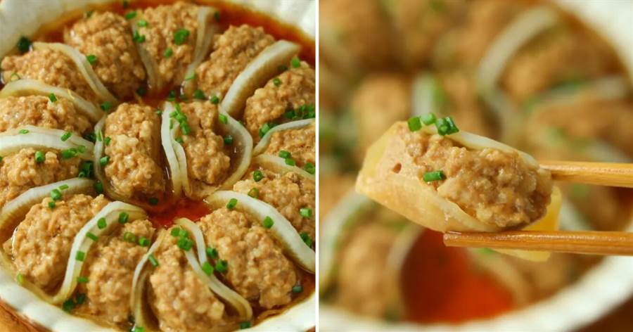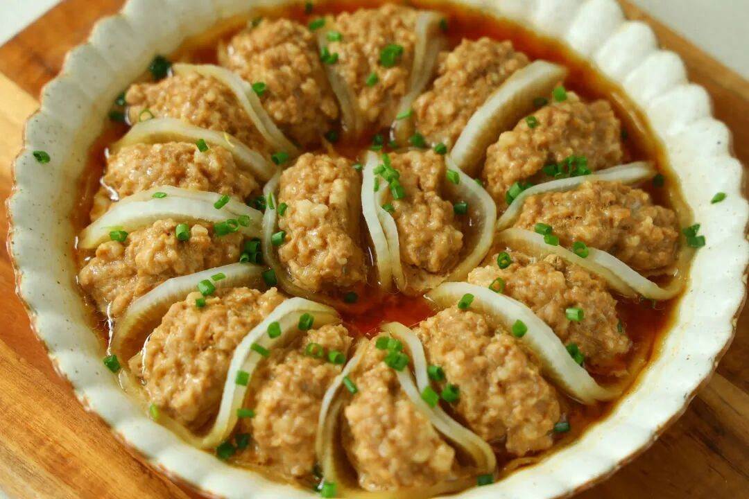 先說說它的長相吧。蒸好的蘿蔔釀肉,白白嫩嫩的蘿蔔片微微透著光,輕輕裹著粉嫩的肉餡,像一個個小巧的月牙餃子,又像一隻只飽滿的小錢袋,乖乖趴在盤子裡。