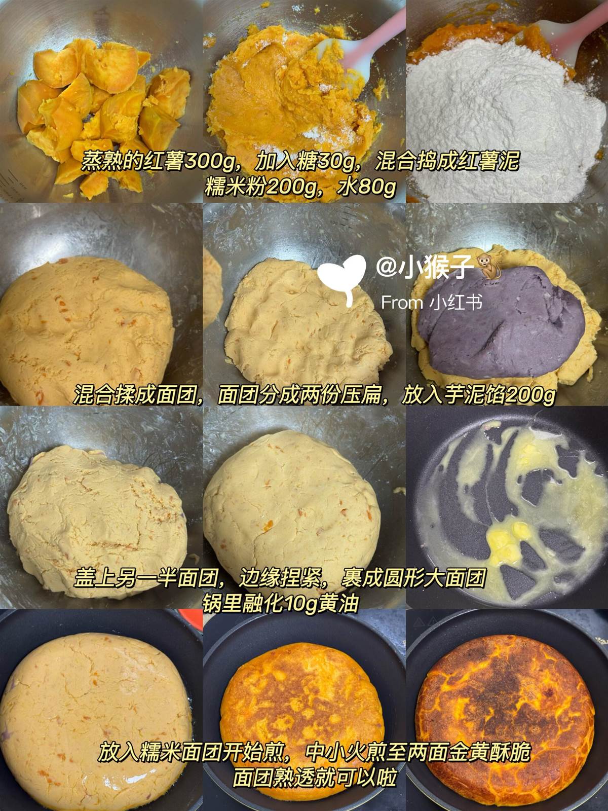 這道甜點真的是為「懶人」量身打造的!紅薯蒸熟壓成泥,直接拌入糯米粉,不用揉麵、不用發酵,像玩黏土一樣包入滿滿的芋泥餡,放進鍋子裡煎到金黃焦脆就完成了!