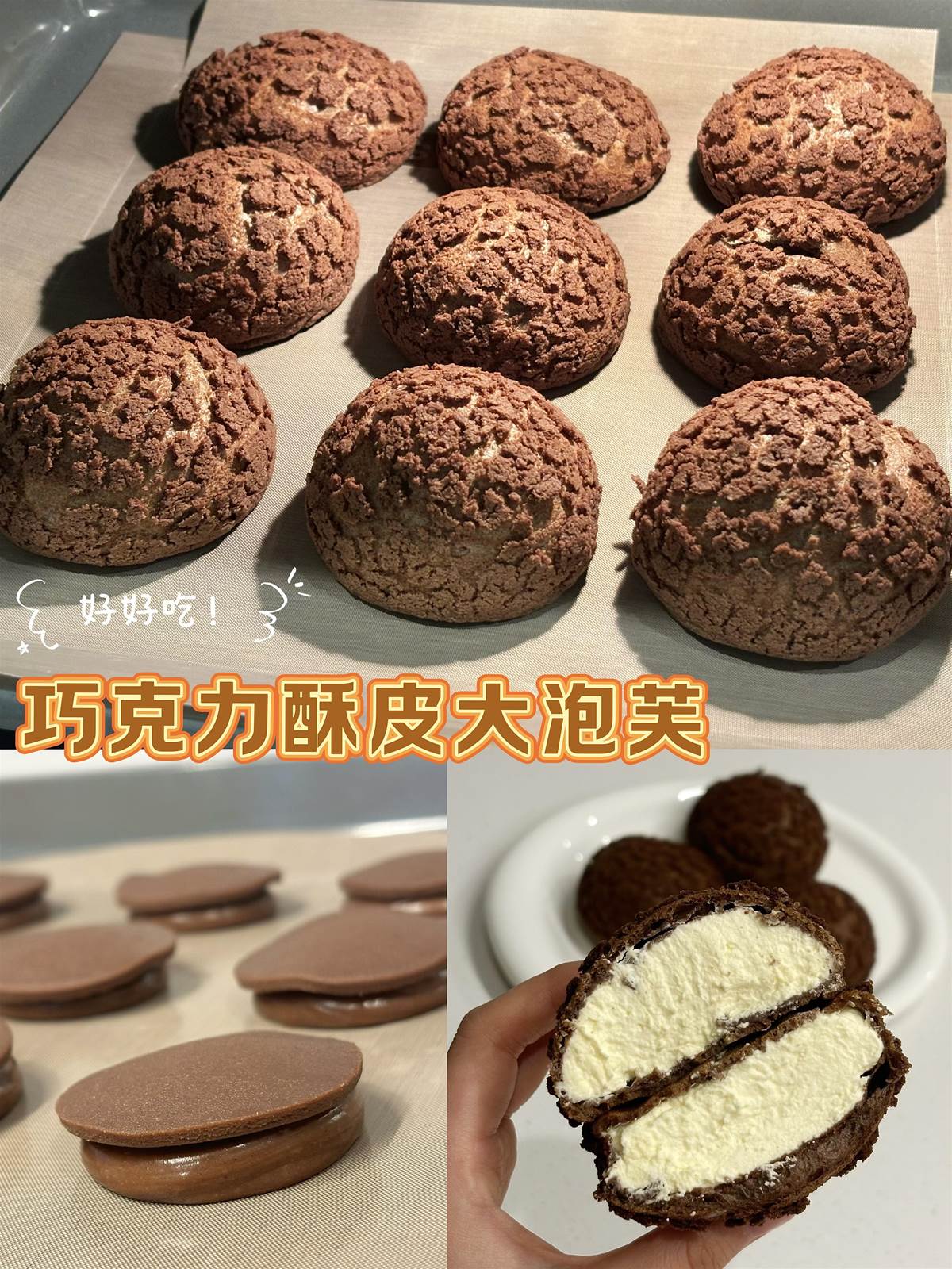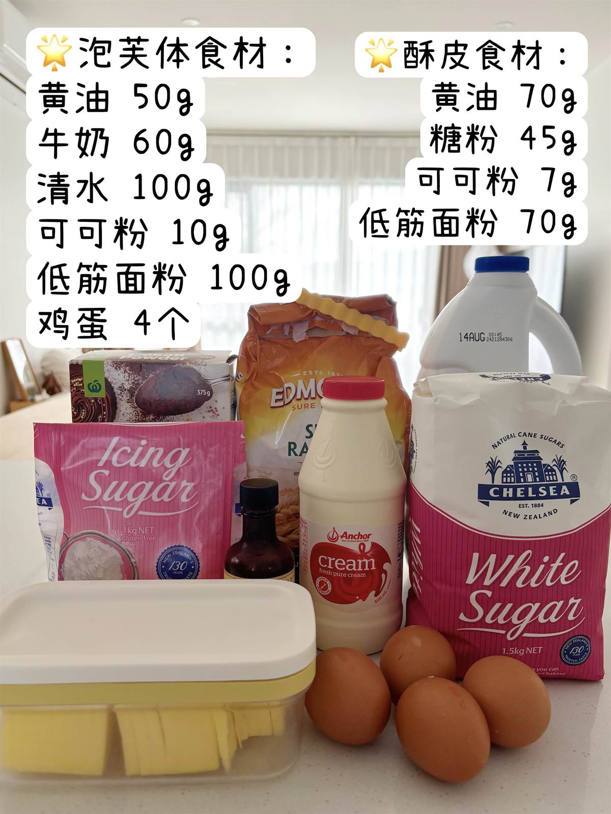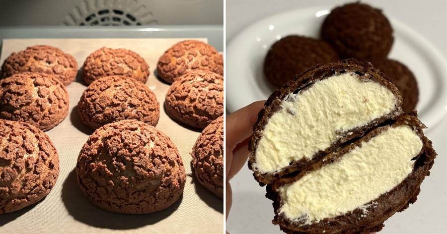 泡芙體食材: 黃油 50g 牛奶 60g 清水 100g 可可粉 10g 低筋面粉 100g 雞蛋 4個(根據情況添加)