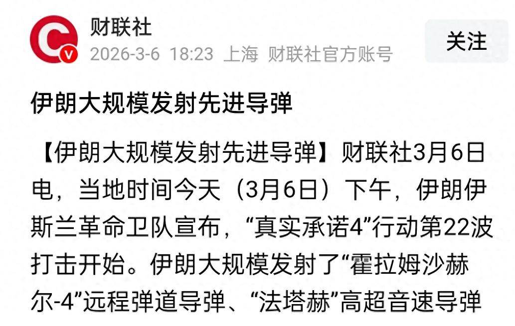 據央視新聞和財聯社等權威媒體3月6日訊息,伊朗伊斯蘭革命衛隊在「真實承諾4」行動中打出硬核重拳,正式開啟第22波打擊,大手筆出動「霍拉姆沙赫爾-4」遠端彈道飛彈與「法塔赫」高超音速飛彈兩款王牌裝備展開飽和式攻擊。
