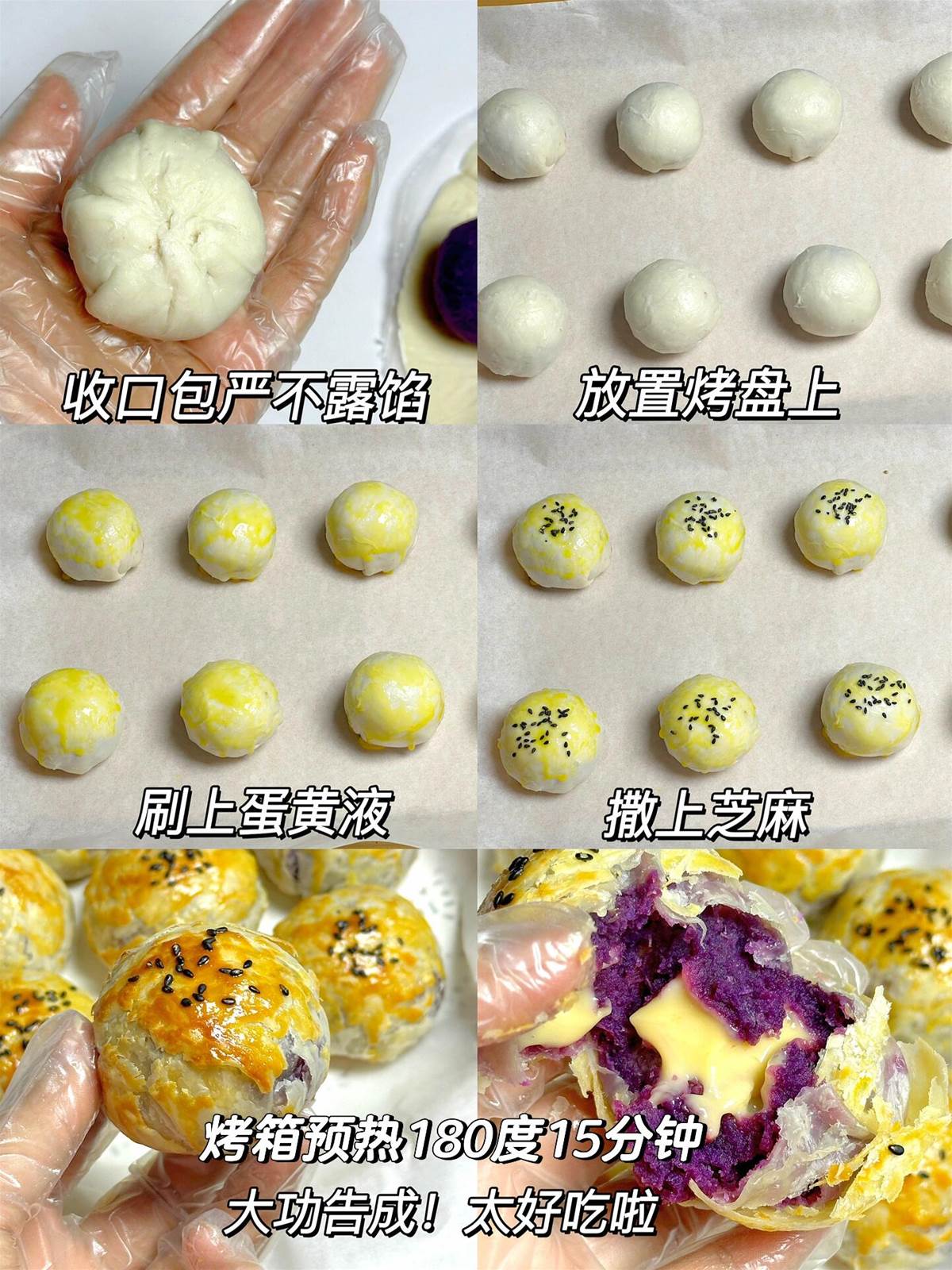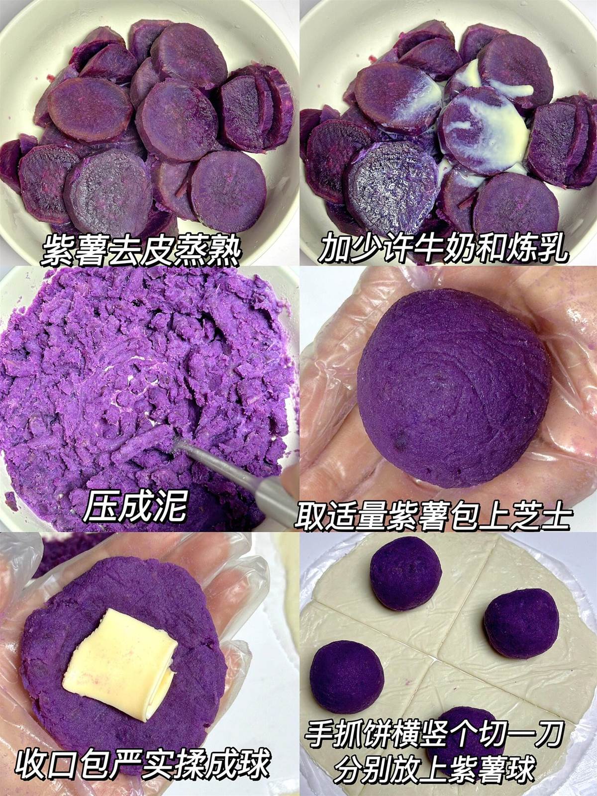 準備材料:紫薯 、冷凍抓餅、黑芝麻、蛋黃、起司片(或起司條)、煉乳適量、牛奶 20 克