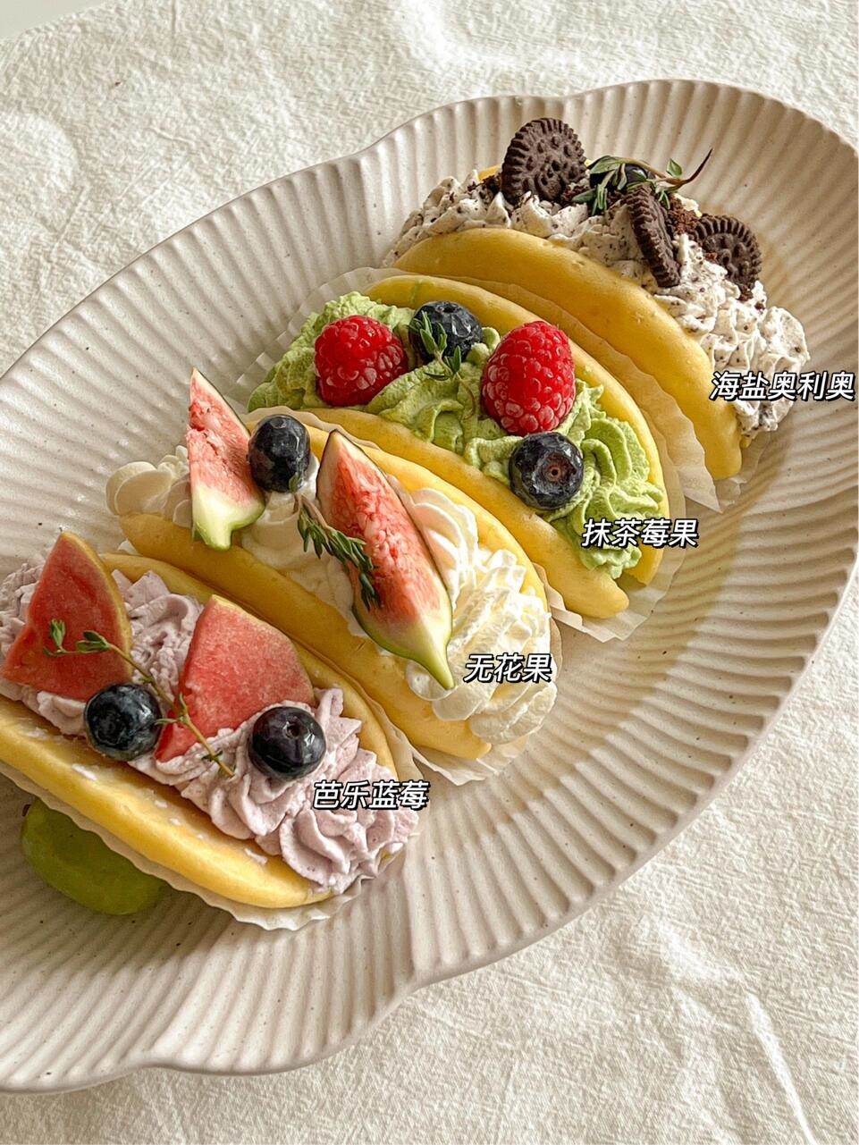 2. 鬆餅糊裝入裱花袋,擠在烤盤上,擠成六個大小均勻的圓(注意要薄薄的,太厚卷的時候容易開裂)