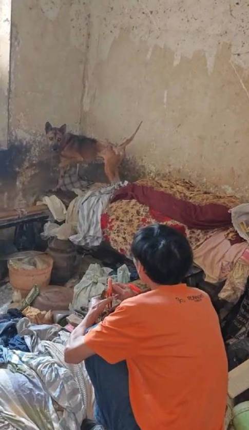 「吱呀」 一聲,佈滿鏽跡的鐵門被緩緩推開,一股混雜著霉味與灰塵的氣息撲面而來。陳明才舉著手機的手頓在半空,眼前的景象讓這位有著三十年救助經驗的老志願者鼻頭一酸 —— 福康村老舊小區的這間屋子裡,棕黑色的小狗正蜷縮在牆角,肋骨根根分明如嶙峋怪石,背部的皮膚潰爛結痂,卻仍對著來人發出微弱卻堅定的低吼,死死守著身後那張堆滿雜物的木板床。