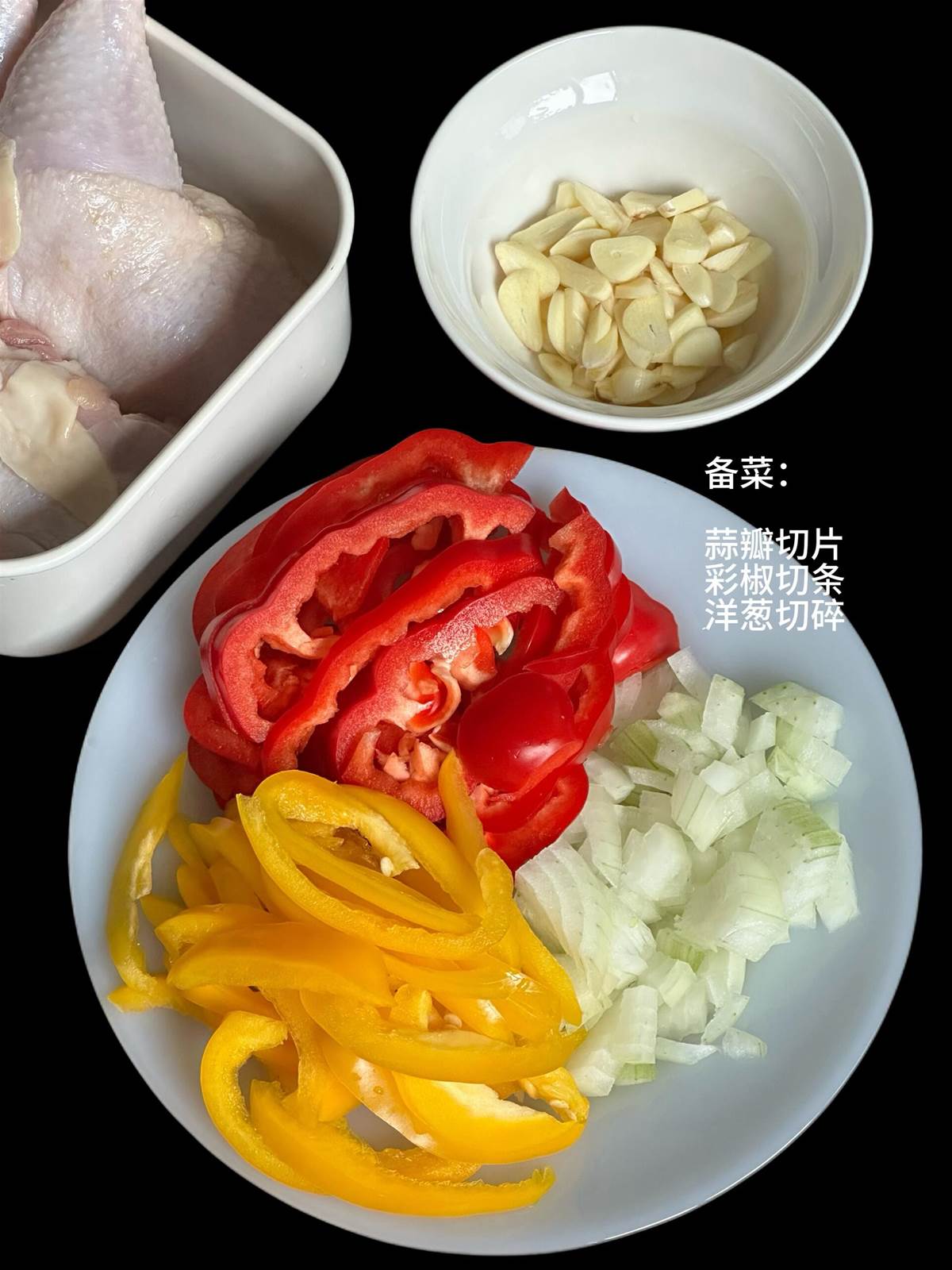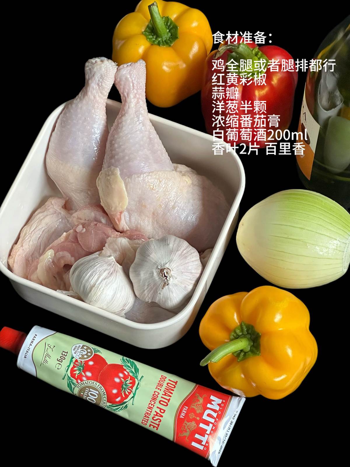 ?食材準備:雞全腿、洋蔥、紅黃彩椒、蒜片、白葡萄酒、濃縮番茄膏