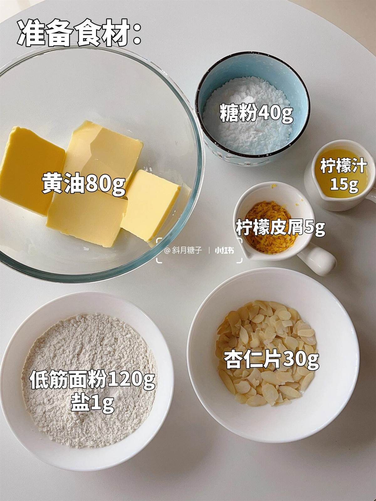 黃油80g、糖粉40g、低筋麵粉120g、檸檬汁15g、檸檬皮屑5g、鹽1g、杏仁片30g