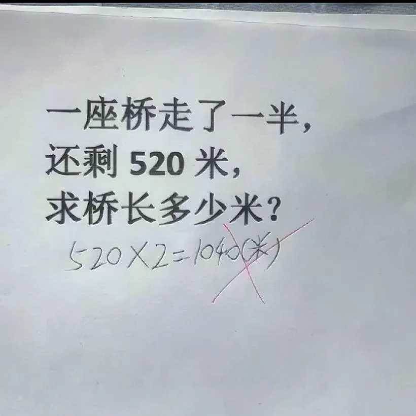有專業人士現身解釋:「一座橋走了一半,一半就是½。½有了,還剩520米,520這個數據也有了。但是,算式中的那個2是從哪里來的 一座橋,走了一半,那剩余的沒有走過的有多少?(1-1/2)=1/2,還剩1/2。