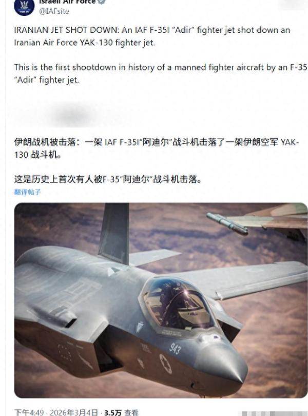 全球軍事圈炸鍋!當地時間3月4日,以色列空軍官方實錘:F-35I隱身戰機在德黑蘭上空,擊落伊朗一架雅克-130。