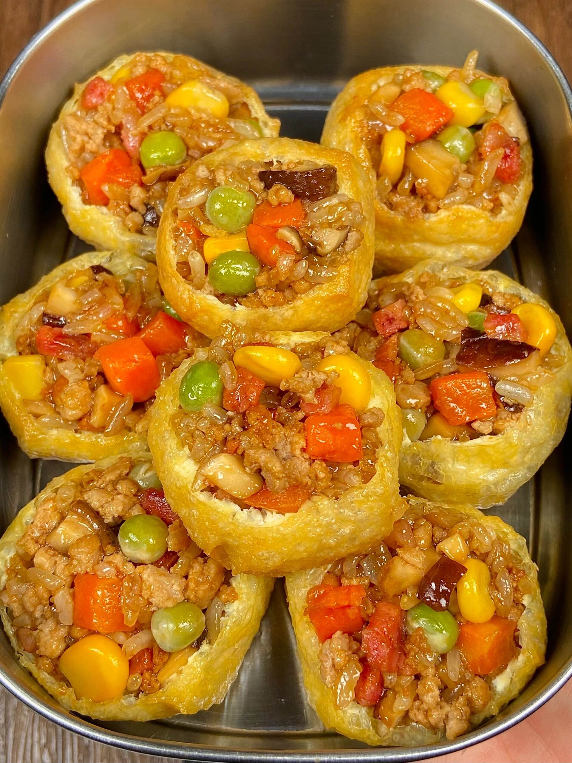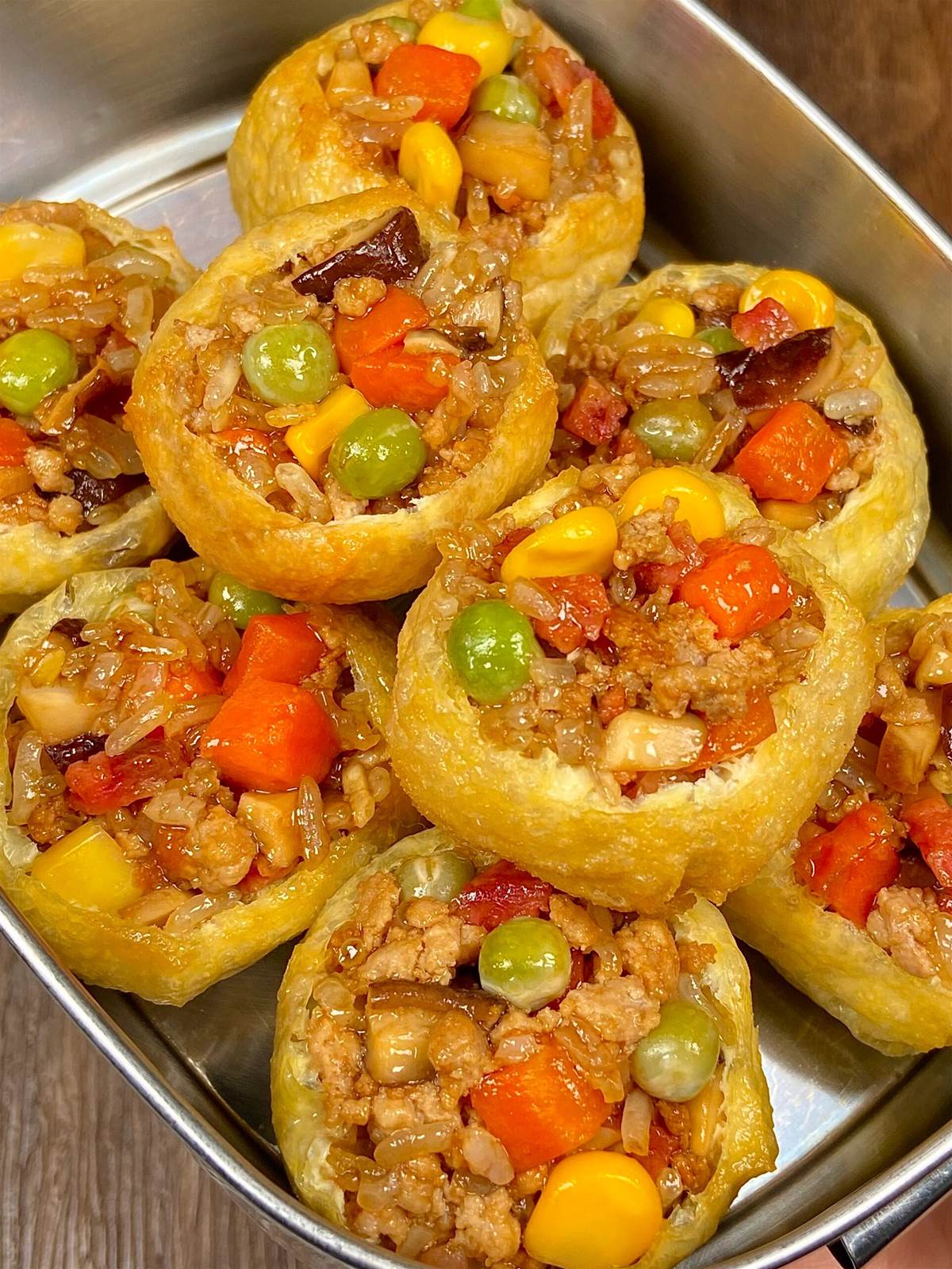 ?食材:糯米、豆腐泡、時蔬粒、臘腸、干香菇
